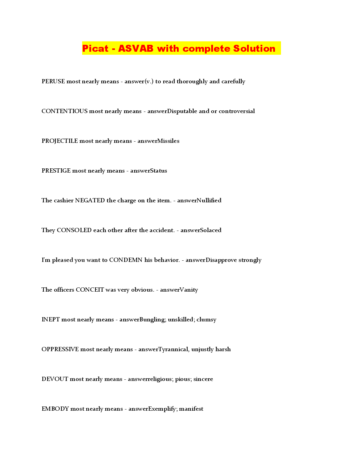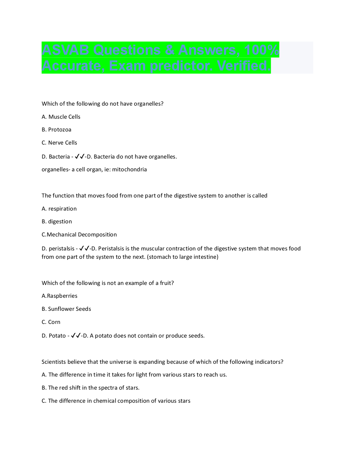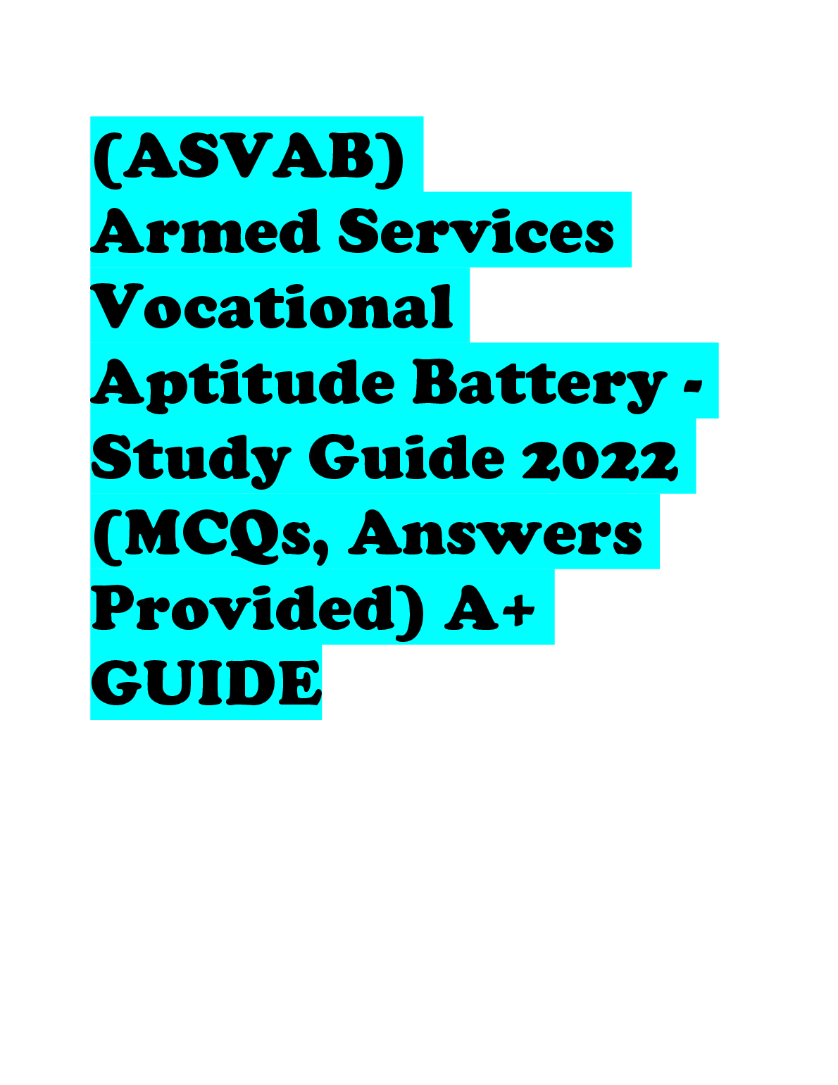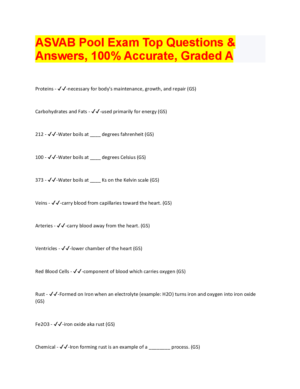 PICAT/ASVAB TEST QUESTIONS (840 Questions – (All versions)) with 100% Correct Answers) Q-Bank $18.00 ASVAB practice test 1 Questions And Answers LATEST UPDATE 2023 $18.00 ASVAB 2022/2023 PREP EXAM UPDATE $18.00 ASVAB Practice test BEST RATED SOLUTION 2023 $18.00 ASVAB Practice Test 1 Mathematics Knowledge. Top Exam Questions and Answers, Rated A+ 2023 $18.00 ASVAB: Arithmetic Reasoning Question and Answer 2023 $18.00 ASVAB practice test, Top Exam Question with accurate answers, 100% Accurate, Graded A+ $18.00 General Science ( Asvab test) Answered Summer 2022 LATEST SOLUTION $18.00 ASVAB Top Questions and answers. 100% Accurate, rated A+2023 $18.00 ASVAB-NAVY EXAM PRACTICE QUESTIONS AND CORRECT ANSWERS 2023 $18.00 ASVAB Electronics Questions and Answers 2023/2024 $18.00 ASVAB BSEP words 2022/2023 UPDATED $18.00 ASVAB Word Knowledge Test 2022/2023 with COMPLETE SOLUTION $18.00 ASVAB: Arithmetic Reasoning Test VERIFIED ANSWERS 2023 $18.00 ASVAB Pool Exam Top Questions & Answers, 100% Accurate, Graded A+ $18.00 Full ASVAB Practice Test 2022/2023 with COMPLETE SOLUTIONS $18.00 ASVAB practice test Questions and answers, 100% Approved. Top Questions WITH VERIFIED SOLUTIONS $18.00 ASVAB 2023 TEST BANK LATEST SOLUTION $18.00 ASVAB practice test Questions And Answers RATED A+ $18.00 ASVAB General Science BEST RATED SOLUTION RATED A+ $18.00 ASVAB Study Guide 2022/2023 UPDATED $18.00 ASVAB Word Knowledge Practice Test Test Result RATED A+ $18.00 ASVAB Practice Test SECTION 1: General Science LATEST SOLUTION GRADED A+ $18.00 ASVAB Section 8: Paragraph comprehension BEST SOLUTION 2023 $18.00 ASVAB Math (2022/2023) LATEST UPDATE RATED A+ $18.00 SOLVED-Elaborated ASVAB GENERAL SCIENCE SOLUTION GUIDE 2023/2024 $18.00 ASVAB Science Pool Questions and answers, 100% Accurate, Graded A $18.00 Picat - ASVAB with complete Solution LATEST UPDATE 2023 $18.00 ASVAB PICAT VERIFICATION TEST WITH VERIFIED ANSWERS 2023 $18.00 Arithmetic Reasoning ASVAB PRACTICE Questions And Answers RATED A+ $18.00 Asvab Mathematics Arithmetic Knowledge WITH VERIFIED ANSWERS 2023 $18.00 General Science (ASVAB) QUESTIONS AND CORRECT ANSWERS 2023 $18.00 ASVAB Paragraph Comprehension Test Test Result SCORED 100% $18.00 Real Asvab test!!! Questions with 100% Accurate answers. Graded A+. Latest 2022/2023 $18.00 Asvab Top Notch Exam Prep Review. 100% Accurate. Approved mastery 2023 $18.00 ASVAB Section 9 : Assembling Objects BEST RATED SOLUTION 2023 $18.00 ASVAB - Practice math problems WITH CORRECT ANSWERS 2023 $18.00 ASVAB Section 7: General Science QUESTIONS AND ANSWERS 2023 $18.00 (ASVAB) Armed Services Vocational Aptitude Battery - Study Guide 2022/2023 (MCQs, Answers Provided) A+ GUIDE $18.00 ASVAB Section 6 : Mathematics Knowledge UPDATED SOLUTION 2023 $18.00 ASVAB Section 1 : Word Knowledge BRAND NEW SOLUTION 2023 $18.00 Practice ASVAB Test Assembling Objects Test Result LATEST SOLUTION $18.00 Asvab Arithmetic Reasoning Actual Practice Test WITH CORRECT & VERIFIED ANSWERS $18.00 ASVAB Questions & Answers, 100% Accurate, Exam predictor. Verified SOLUTION 2023 $18.00 ASVAB Auto and Shop information Study Questions with COMPLETE SOLUTION BRAND NEW!! $18.00 Picat Asvab Review 2022 /2023 UPDATED VERSION $18.00 ASVAB Test Prep UPDATED EDITION FOR 2023/2024 $18.00