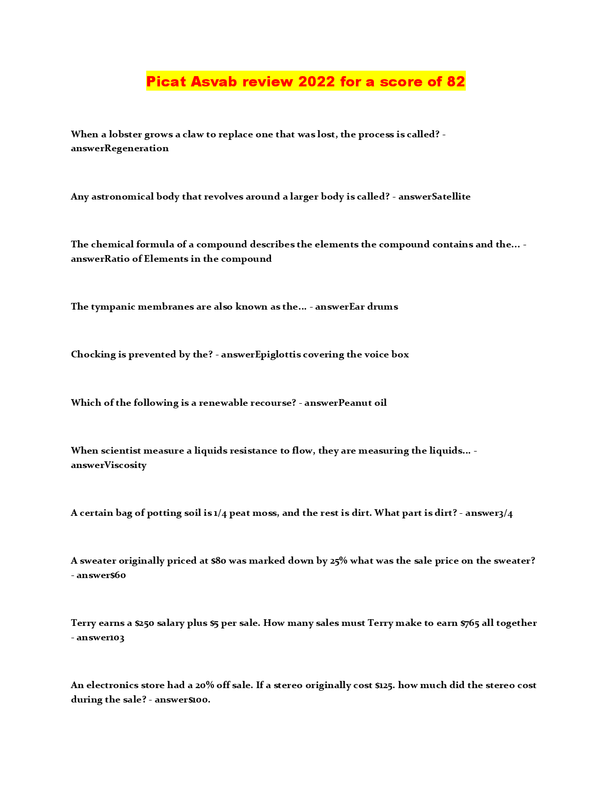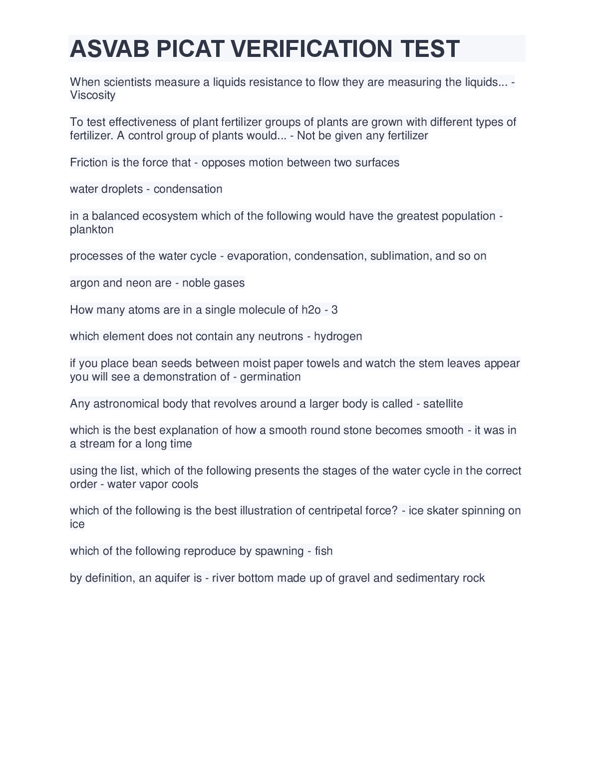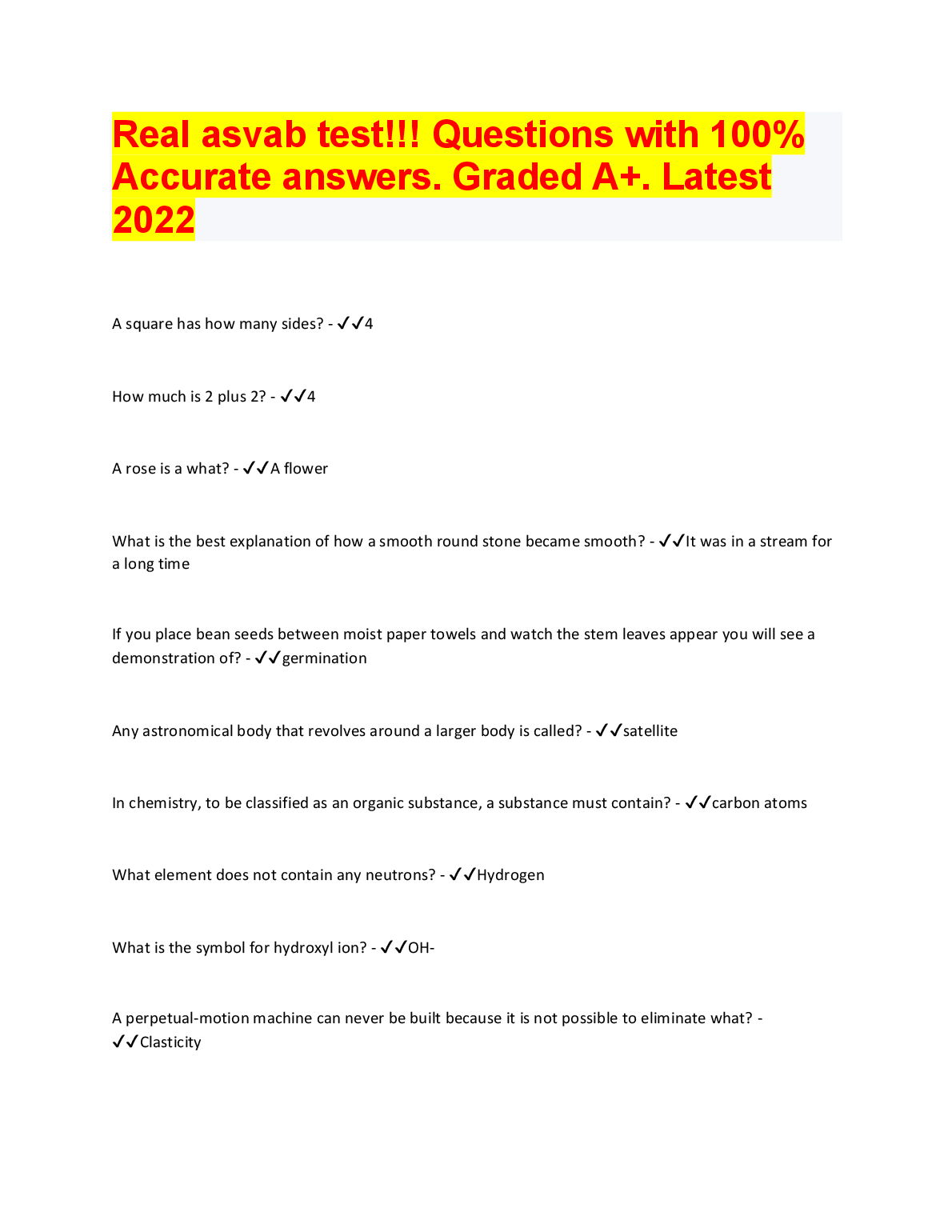 PICAT/ASVAB TEST QUESTIONS (840 Questions – (All versions)) with 100% Correct Answers) Q-Bank $18.00 ASVAB practice test 1 Questions And Answers LATEST UPDATE 2023 $18.00 ASVAB 2022/2023 PREP EXAM UPDATE $18.00 ASVAB Practice test BEST RATED SOLUTION 2023 $18.00 ASVAB Practice Test 1 Mathematics Knowledge. Top Exam Questions and Answers, Rated A+ 2023 $18.00 ASVAB: Arithmetic Reasoning Question and Answer 2023 $18.00 ASVAB practice test, Top Exam Question with accurate answers, 100% Accurate, Graded A+ $18.00 General Science ( Asvab test) Answered Summer 2022 LATEST SOLUTION $18.00 ASVAB Top Questions and answers. 100% Accurate, rated A+2023 $18.00 ASVAB-NAVY EXAM PRACTICE QUESTIONS AND CORRECT ANSWERS 2023 $18.00 ASVAB Electronics Questions and Answers 2023/2024 $18.00 ASVAB BSEP words 2022/2023 UPDATED $18.00 ASVAB Word Knowledge Test 2022/2023 with COMPLETE SOLUTION $18.00 ASVAB: Arithmetic Reasoning Test VERIFIED ANSWERS 2023 $18.00 ASVAB Pool Exam Top Questions & Answers, 100% Accurate, Graded A+ $18.00 Full ASVAB Practice Test 2022/2023 with COMPLETE SOLUTIONS $18.00 ASVAB practice test Questions and answers, 100% Approved. Top Questions WITH VERIFIED SOLUTIONS $18.00 ASVAB 2023 TEST BANK LATEST SOLUTION $18.00 ASVAB practice test Questions And Answers RATED A+ $18.00 ASVAB General Science BEST RATED SOLUTION RATED A+ $18.00 ASVAB Study Guide 2022/2023 UPDATED $18.00 ASVAB Word Knowledge Practice Test Test Result RATED A+ $18.00 ASVAB Practice Test SECTION 1: General Science LATEST SOLUTION GRADED A+ $18.00 ASVAB Section 8: Paragraph comprehension BEST SOLUTION 2023 $18.00 ASVAB Math (2022/2023) LATEST UPDATE RATED A+ $18.00 SOLVED-Elaborated ASVAB GENERAL SCIENCE SOLUTION GUIDE 2023/2024 $18.00 ASVAB Science Pool Questions and answers, 100% Accurate, Graded A $18.00 Picat - ASVAB with complete Solution LATEST UPDATE 2023 $18.00 ASVAB PICAT VERIFICATION TEST WITH VERIFIED ANSWERS 2023 $18.00 Arithmetic Reasoning ASVAB PRACTICE Questions And Answers RATED A+ $18.00 Asvab Mathematics Arithmetic Knowledge WITH VERIFIED ANSWERS 2023 $18.00 General Science (ASVAB) QUESTIONS AND CORRECT ANSWERS 2023 $18.00 ASVAB Paragraph Comprehension Test Test Result SCORED 100% $18.00 Real Asvab test!!! Questions with 100% Accurate answers. Graded A+. Latest 2022/2023 $18.00 Asvab Top Notch Exam Prep Review. 100% Accurate. Approved mastery 2023 $18.00 ASVAB Section 9 : Assembling Objects BEST RATED SOLUTION 2023 $18.00 ASVAB - Practice math problems WITH CORRECT ANSWERS 2023 $18.00 ASVAB Section 7: General Science QUESTIONS AND ANSWERS 2023 $18.00 (ASVAB) Armed Services Vocational Aptitude Battery - Study Guide 2022/2023 (MCQs, Answers Provided) A+ GUIDE $18.00 ASVAB Section 6 : Mathematics Knowledge UPDATED SOLUTION 2023 $18.00 ASVAB Section 1 : Word Knowledge BRAND NEW SOLUTION 2023 $18.00 Practice ASVAB Test Assembling Objects Test Result LATEST SOLUTION $18.00 Asvab Arithmetic Reasoning Actual Practice Test WITH CORRECT & VERIFIED ANSWERS $18.00 ASVAB Questions & Answers, 100% Accurate, Exam predictor. Verified SOLUTION 2023 $18.00 ASVAB Auto and Shop information Study Questions with COMPLETE SOLUTION BRAND NEW!! $18.00 Picat Asvab Review 2022 /2023 UPDATED VERSION $18.00 ASVAB Test Prep UPDATED EDITION FOR 2023/2024 $18.00