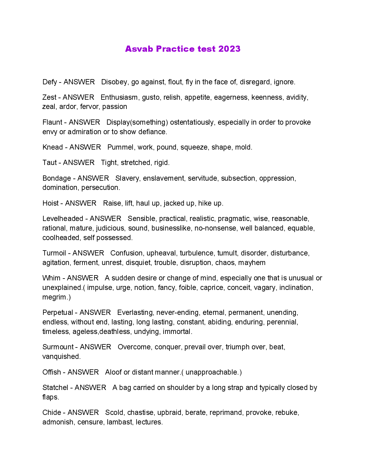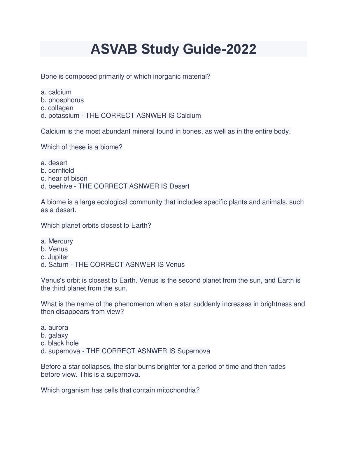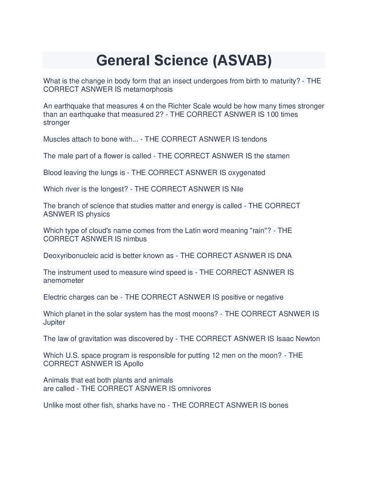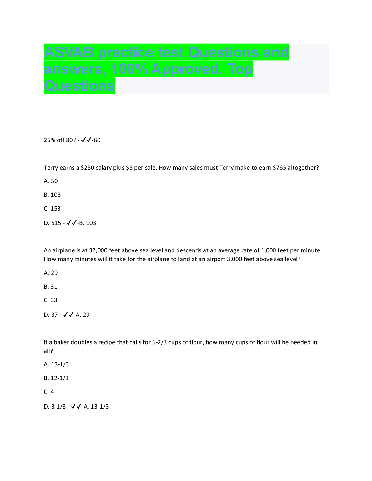 PICAT/ASVAB TEST QUESTIONS (840 Questions – (All versions)) with 100% Correct Answers) Q-Bank $18.00 ASVAB practice test 1 Questions And Answers LATEST UPDATE 2023 $18.00 ASVAB 2022/2023 PREP EXAM UPDATE $18.00 ASVAB Practice test BEST RATED SOLUTION 2023 $18.00 ASVAB Practice Test 1 Mathematics Knowledge. Top Exam Questions and Answers, Rated A+ 2023 $18.00 ASVAB: Arithmetic Reasoning Question and Answer 2023 $18.00 ASVAB practice test, Top Exam Question with accurate answers, 100% Accurate, Graded A+ $18.00 General Science ( Asvab test) Answered Summer 2022 LATEST SOLUTION $18.00 ASVAB Top Questions and answers. 100% Accurate, rated A+2023 $18.00 ASVAB-NAVY EXAM PRACTICE QUESTIONS AND CORRECT ANSWERS 2023 $18.00 ASVAB Electronics Questions and Answers 2023/2024 $18.00 ASVAB BSEP words 2022/2023 UPDATED $18.00 ASVAB Word Knowledge Test 2022/2023 with COMPLETE SOLUTION $18.00 ASVAB: Arithmetic Reasoning Test VERIFIED ANSWERS 2023 $18.00 ASVAB Pool Exam Top Questions & Answers, 100% Accurate, Graded A+ $18.00 Full ASVAB Practice Test 2022/2023 with COMPLETE SOLUTIONS $18.00 ASVAB practice test Questions and answers, 100% Approved. Top Questions WITH VERIFIED SOLUTIONS $18.00 ASVAB 2023 TEST BANK LATEST SOLUTION $18.00 ASVAB practice test Questions And Answers RATED A+ $18.00 ASVAB General Science BEST RATED SOLUTION RATED A+ $18.00 ASVAB Study Guide 2022/2023 UPDATED $18.00 ASVAB Word Knowledge Practice Test Test Result RATED A+ $18.00 ASVAB Practice Test SECTION 1: General Science LATEST SOLUTION GRADED A+ $18.00 ASVAB Section 8: Paragraph comprehension BEST SOLUTION 2023 $18.00 ASVAB Math (2022/2023) LATEST UPDATE RATED A+ $18.00 SOLVED-Elaborated ASVAB GENERAL SCIENCE SOLUTION GUIDE 2023/2024 $18.00 ASVAB Science Pool Questions and answers, 100% Accurate, Graded A $18.00 Picat - ASVAB with complete Solution LATEST UPDATE 2023 $18.00 ASVAB PICAT VERIFICATION TEST WITH VERIFIED ANSWERS 2023 $18.00 Arithmetic Reasoning ASVAB PRACTICE Questions And Answers RATED A+ $18.00 Asvab Mathematics Arithmetic Knowledge WITH VERIFIED ANSWERS 2023 $18.00 General Science (ASVAB) QUESTIONS AND CORRECT ANSWERS 2023 $18.00 ASVAB Paragraph Comprehension Test Test Result SCORED 100% $18.00 Real Asvab test!!! Questions with 100% Accurate answers. Graded A+. Latest 2022/2023 $18.00 Asvab Top Notch Exam Prep Review. 100% Accurate. Approved mastery 2023 $18.00 ASVAB Section 9 : Assembling Objects BEST RATED SOLUTION 2023 $18.00 ASVAB - Practice math problems WITH CORRECT ANSWERS 2023 $18.00 ASVAB Section 7: General Science QUESTIONS AND ANSWERS 2023 $18.00 (ASVAB) Armed Services Vocational Aptitude Battery - Study Guide 2022/2023 (MCQs, Answers Provided) A+ GUIDE $18.00 ASVAB Section 6 : Mathematics Knowledge UPDATED SOLUTION 2023 $18.00 ASVAB Section 1 : Word Knowledge BRAND NEW SOLUTION 2023 $18.00 Practice ASVAB Test Assembling Objects Test Result LATEST SOLUTION $18.00 Asvab Arithmetic Reasoning Actual Practice Test WITH CORRECT & VERIFIED ANSWERS $18.00 ASVAB Questions & Answers, 100% Accurate, Exam predictor. Verified SOLUTION 2023 $18.00 ASVAB Auto and Shop information Study Questions with COMPLETE SOLUTION BRAND NEW!! $18.00 Picat Asvab Review 2022 /2023 UPDATED VERSION $18.00 ASVAB Test Prep UPDATED EDITION FOR 2023/2024 $18.00