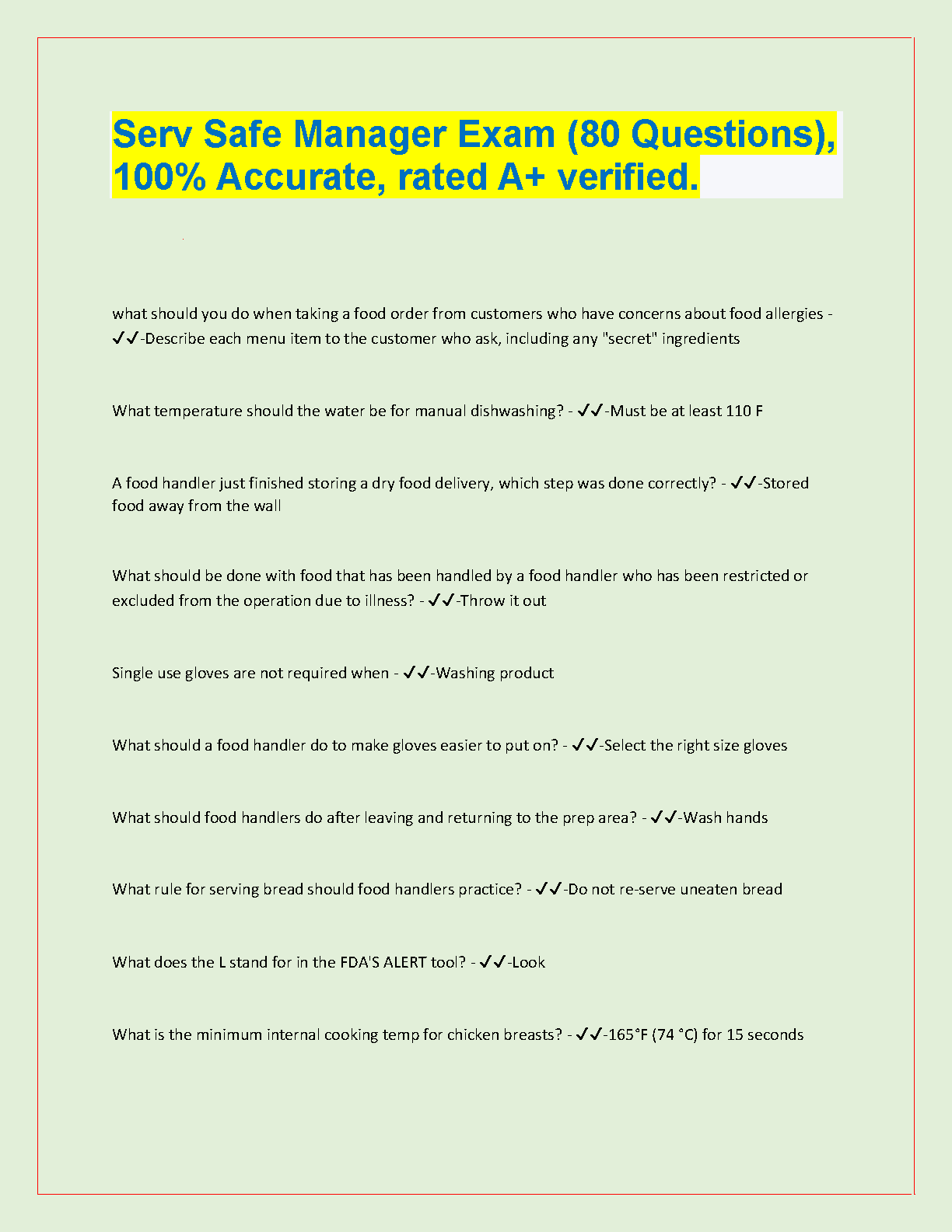 This comprehensive resource is packed with 80 questions for ServSafe Manager Exam. Get ready for the exam and be confident in your knowledge. This 2024-2025 edition is designed to help you pass the exam on your first try and avoid resits.