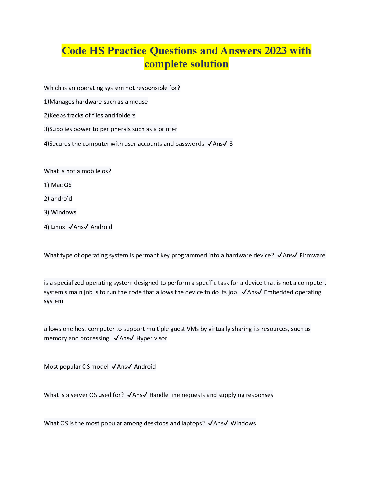 Code HS Practice Questions and Answers 2023 with complete solution - Latest Edition