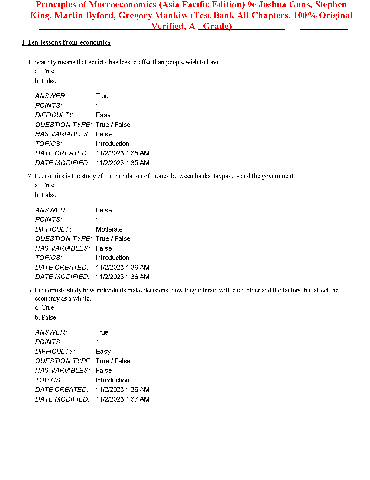 This is a test bank for the 9th edition of Principles of Macroeconomics (Asia Pacific Edition) by Joshua Gans, Stephen King, Martin Byford, and Gregory Mankiw. The test bank includes all chapters and is 100% original and verified. It is an excellent resource for students who want to get a good grade on their exams.