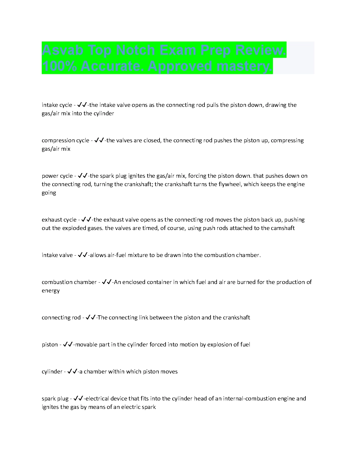 ASVAB practice test 1 Questions And Answers LATEST UPDATE 2023 $18.00 ASVAB 2022/2023 PREP EXAM UPDATE $18.00 ASVAB Practice test BEST RATED SOLUTION 2023 $18.00 ASVAB Practice Test 1 Mathematics Knowledge. Top Exam Questions and Answers, Rated A+ 2023 $18.00 ASVAB: Arithmetic Reasoning Question and Answer 2023 $18.00 ASVAB practice test, Top Exam Question with accurate answers, 100% Accurate, Graded A+ $18.00 General Science ( Asvab test) Answered Summer 2022 LATEST SOLUTION $18.00 ASVAB Top Questions and answers. 100% Accurate, rated A+2023 $18.00 Asvab Mathematics Arithmetic Knowledge WITH VERIFIED ANSWERS 2023 $18.00 ASVAB Section 7: General Science QUESTIONS AND ANSWERS 2023 $18.00 ASVAB Practice Test SECTION 1: General Science LATEST SOLUTION GRADED A+ $18.00 PICAT/ASVAB TEST QUESTIONS (840 Questions – (All versions)) with 100% Correct Answers) Q-Bank $18.00 ASVAB-NAVY EXAM PRACTICE QUESTIONS AND CORRECT ANSWERS 2023 $18.00 ASVAB Electronics Questions and Answers 2023/2024 $18.00 ASVAB BSEP words 2022/2023 UPDATED $18.00 ASVAB Word Knowledge Test 2022/2023 with COMPLETE SOLUTION $18.00 ASVAB: Arithmetic Reasoning Test VERIFIED ANSWERS 2023 $18.00 ASVAB Pool Exam Top Questions & Answers, 100% Accurate, Graded A+ $18.00 ASVAB practice test Questions And Answers RATED A+ $18.00 Full ASVAB Practice Test 2022/2023 with COMPLETE SOLUTIONS $18.00 ASVAB practice test Questions and answers, 100% Approved. Top Questions WITH VERIFIED SOLUTIONS $18.00 ASVAB 2023 TEST BANK LATEST SOLUTION $18.00 ASVAB General Science BEST RATED SOLUTION RATED A+ $18.00 ASVAB Study Guide 2022/2023 UPDATED $18.00 General Science (ASVAB) QUESTIONS AND CORRECT ANSWERS 2023 $18.00 ASVAB Word Knowledge Practice Test Test Result RATED A+ $18.00 ASVAB Paragraph Comprehension Test Test Result SCORED 100% $18.00 Real Asvab test!!! Questions with 100% Accurate answers. Graded A+. Latest 2022/2023 $18.00 ASVAB Section 8: Paragraph comprehension BEST SOLUTION 2023 $18.00 ASVAB Math (2022/2023) LATEST UPDATE RATED A+ $18.00 SOLVED-Elaborated ASVAB GENERAL SCIENCE SOLUTION GUIDE 2023/2024 $18.00 ASVAB Science Pool Questions and answers, 100% Accurate, Graded A $18.00 Picat - ASVAB with complete Solution LATEST UPDATE 2023 $18.00 ASVAB PICAT VERIFICATION TEST WITH VERIFIED ANSWERS 2023 $18.00 Arithmetic Reasoning ASVAB PRACTICE Questions And Answers RATED A+ $18.00 ASVAB Questions & Answers, 100% Accurate, Exam predictor. Verified SOLUTION 2023 $18.00 Asvab Top Notch Exam Prep Review. 100% Accurate. Approved mastery 2023 $18.00 ASVAB - Practice math problems WITH CORRECT ANSWERS 2023 $18.00 ASVAB Section 9 : Assembling Objects BEST RATED SOLUTION 2023 $18.00 Practice ASVAB Test Assembling Objects Test Result LATEST SOLUTION $18.00 ASVAB Section 6 : Mathematics Knowledge UPDATED SOLUTION 2023 $18.00 (ASVAB) Armed Services Vocational Aptitude Battery - Study Guide 2022/2023 (MCQs, Answers Provided) A+ GUIDE $18.00 ASVAB Section 1 : Word Knowledge BRAND NEW SOLUTION 2023 $18.00 Asvab Arithmetic Reasoning Actual Practice Test WITH CORRECT & VERIFIED ANSWERS $18.00 ASVAB Auto and Shop information Study Questions with COMPLETE SOLUTION BRAND NEW!! $18.00 Picat Asvab Review 2022 /2023 UPDATED VERSION $18.00 ASVAB Test Prep UPDATED EDITION FOR 2023/2024 $18.00