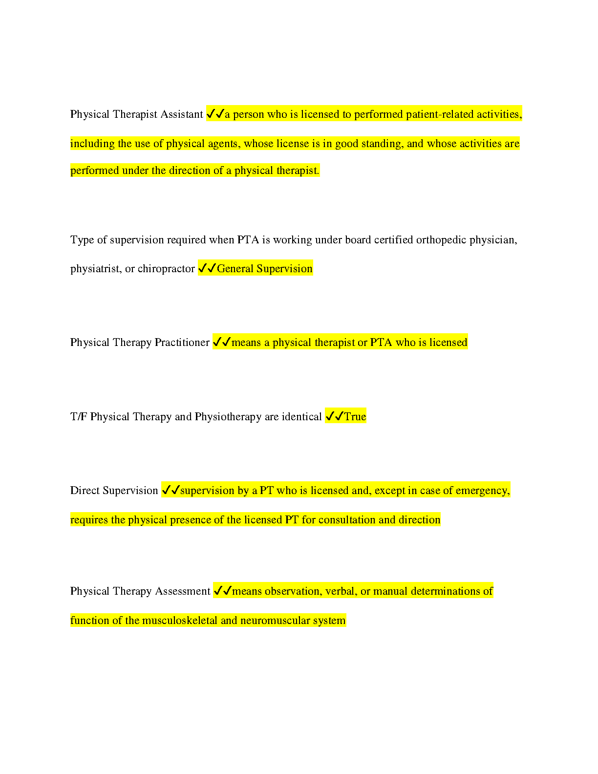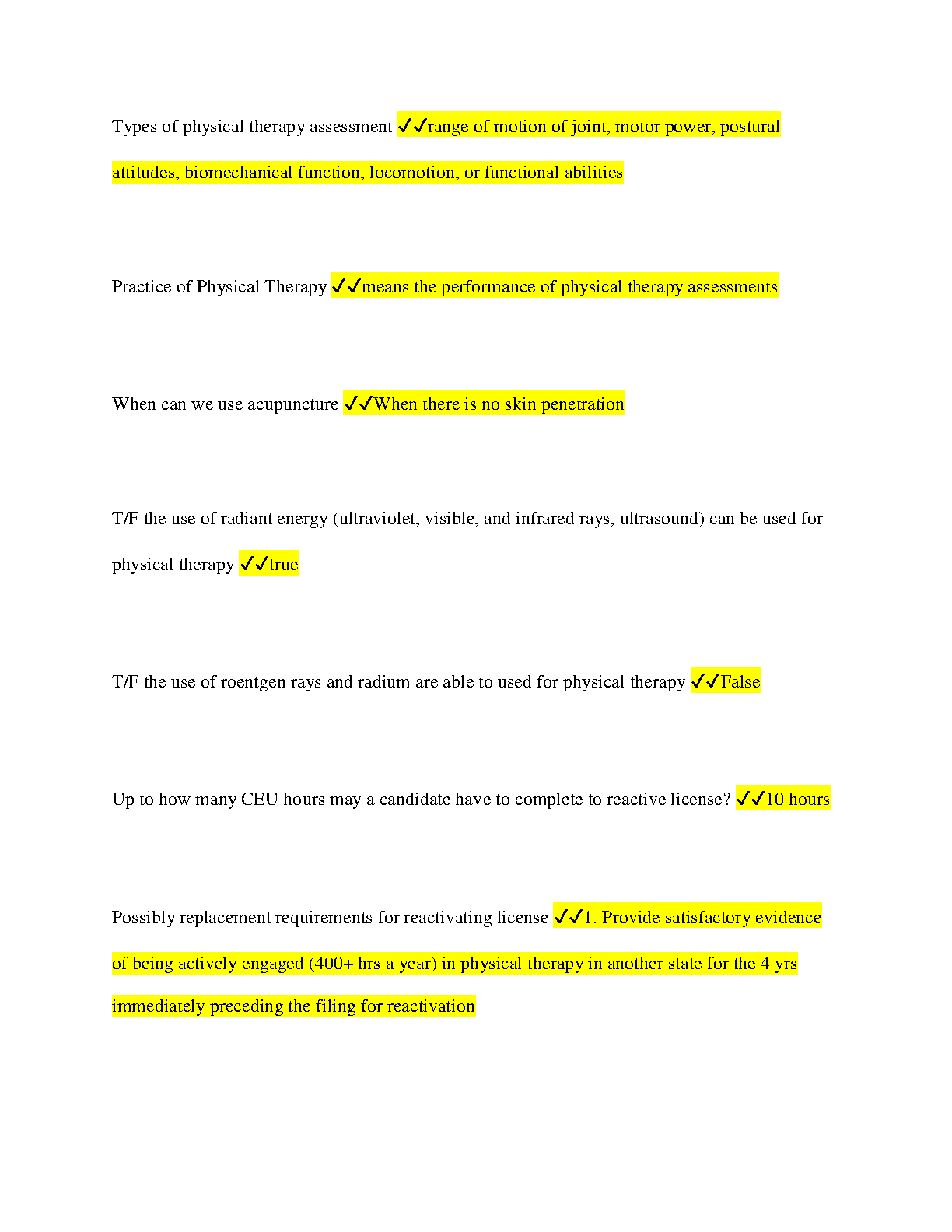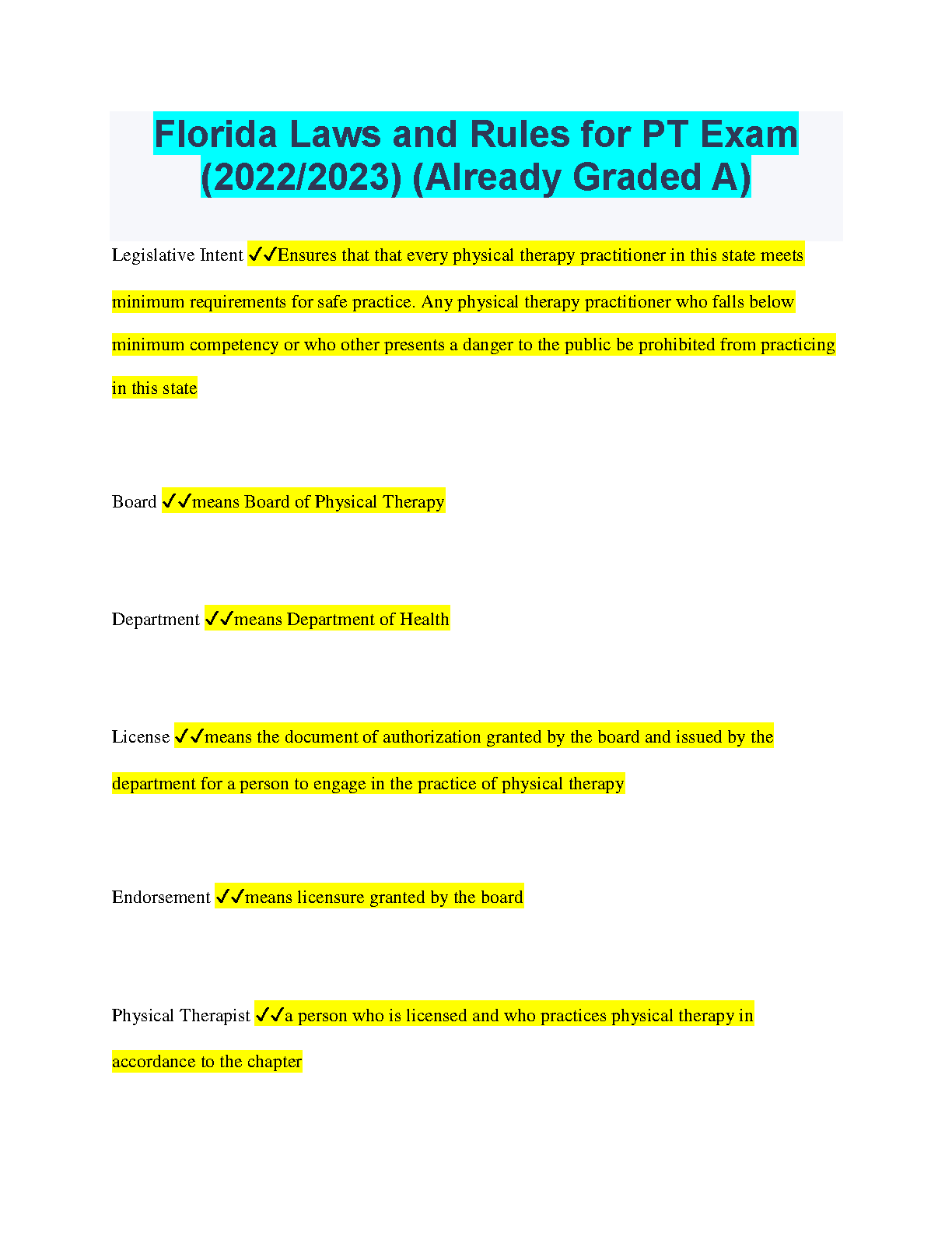 Florida Laws and Rules for PT Exam 2022/2023 (Already Graded A) provides a comprehensive overview of the laws and rules governing physical therapy practice in Florida. This resource is ideal for students preparing for the PT exam and can help them achieve a passing score on their first attempt.