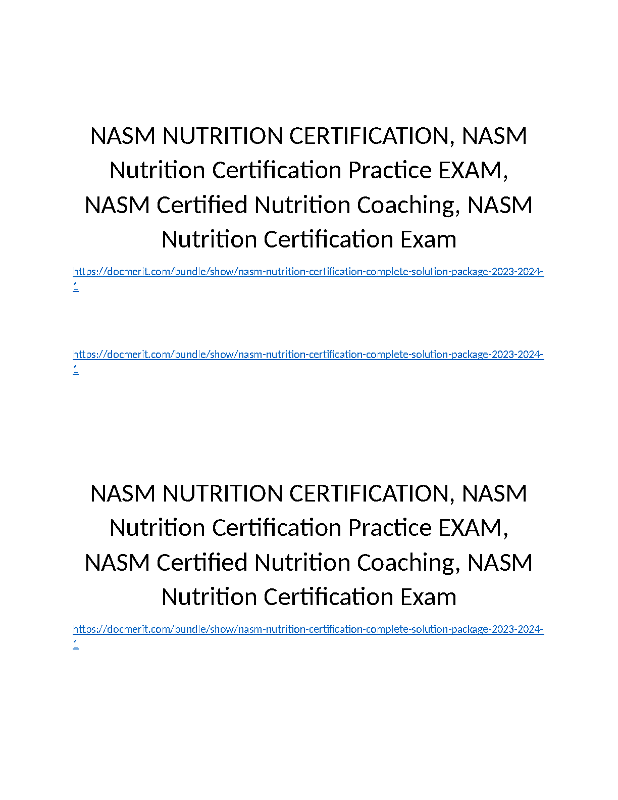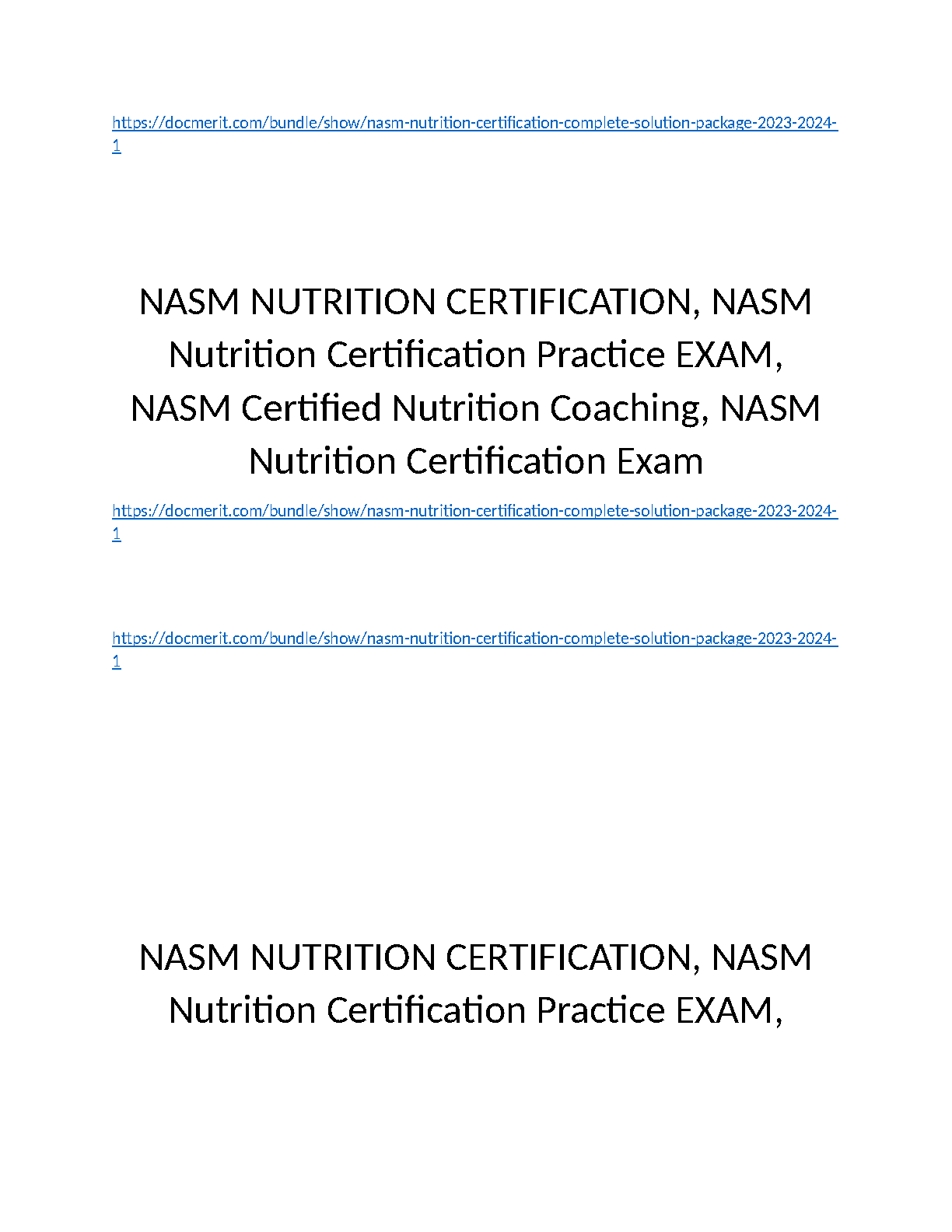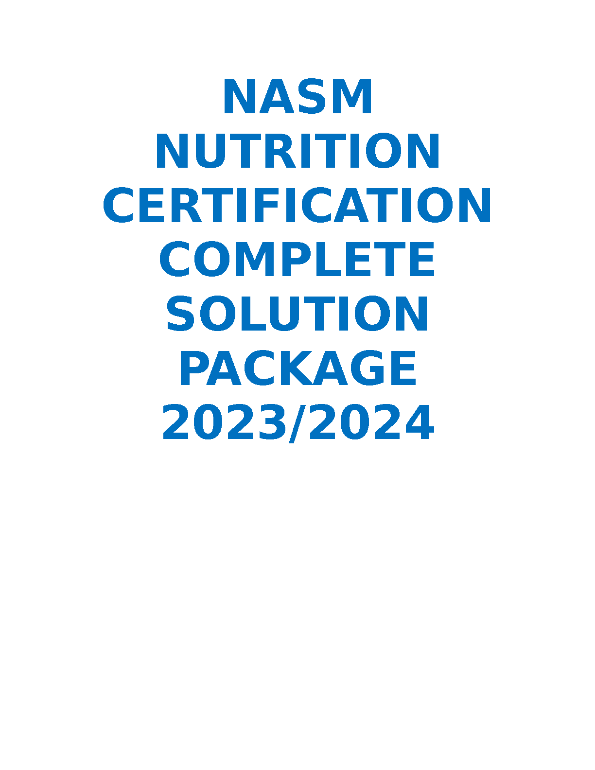 This complete solution package for the NASM Nutrition Certification exam is designed to help you pass on your first attempt. It includes all the study materials you need, including practice questions, flashcards, and a comprehensive study guide.