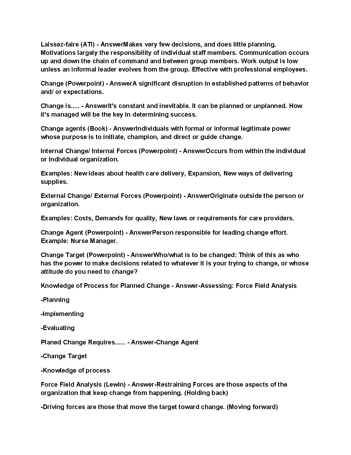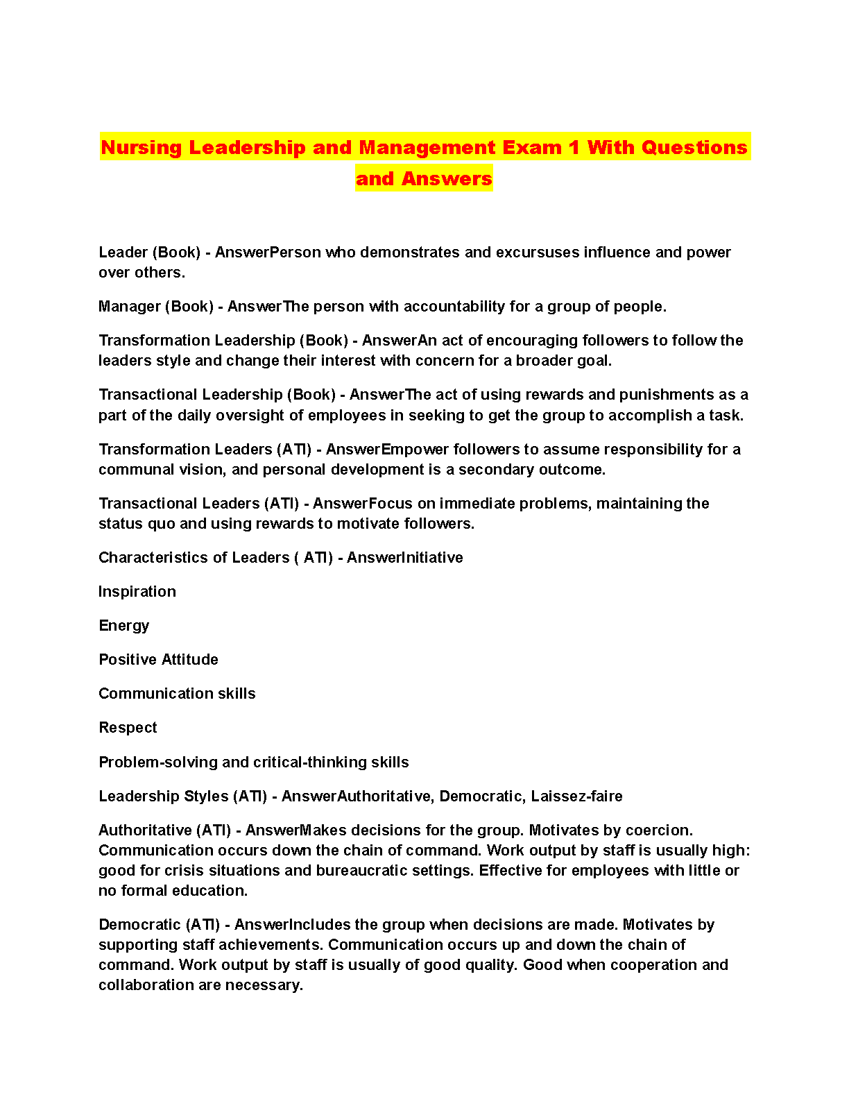 Ace your Nursing Leadership and Management Exam 1 with this comprehensive resource! This exam prep guide includes a wide range of questions and answers covering essential topics like leadership styles, management strategies, ethical considerations, and more. Gain a deep understanding of key concepts and master the skills needed to excel on your exam.