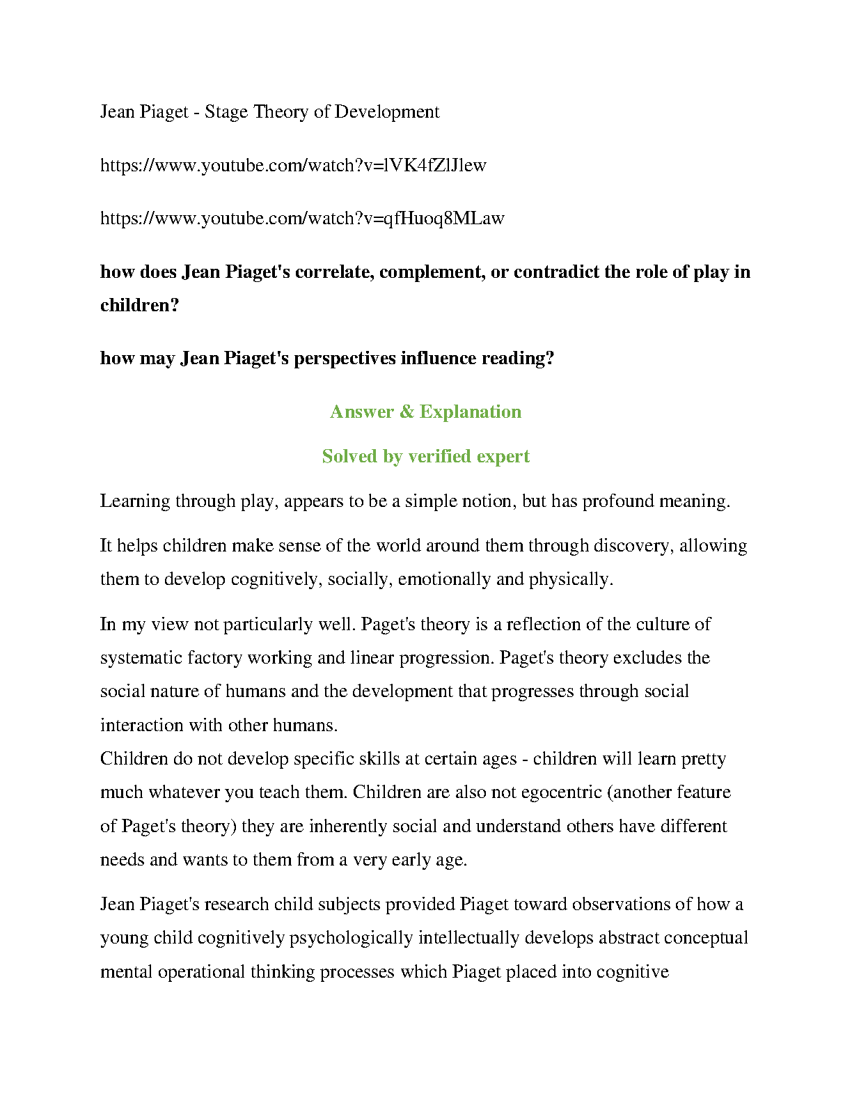 Jean Piaget's Stage Theory of Development Explained - Solved by Verified Expert