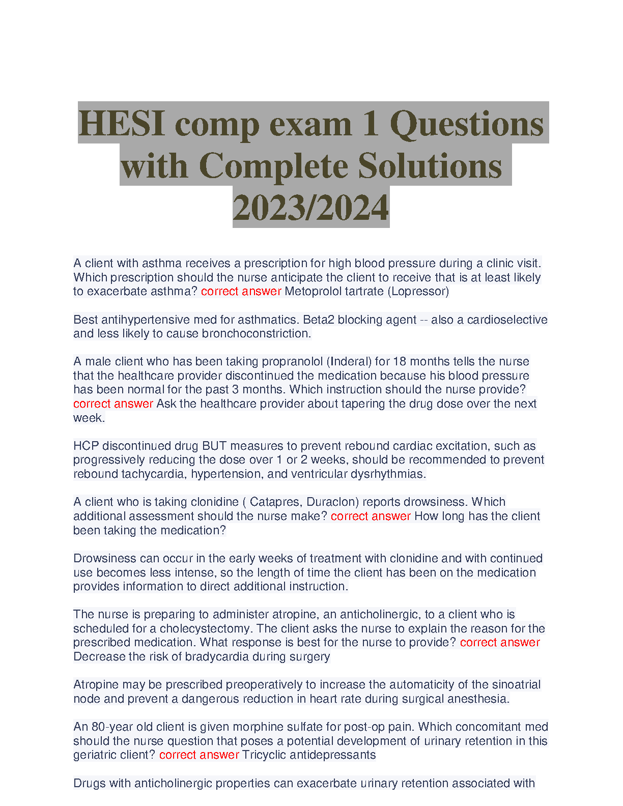 HESI Comp Exam 1 Questions with Complete Solutions 2023/2024 - Ace Your Exams on the First Attempt - Latest Edition