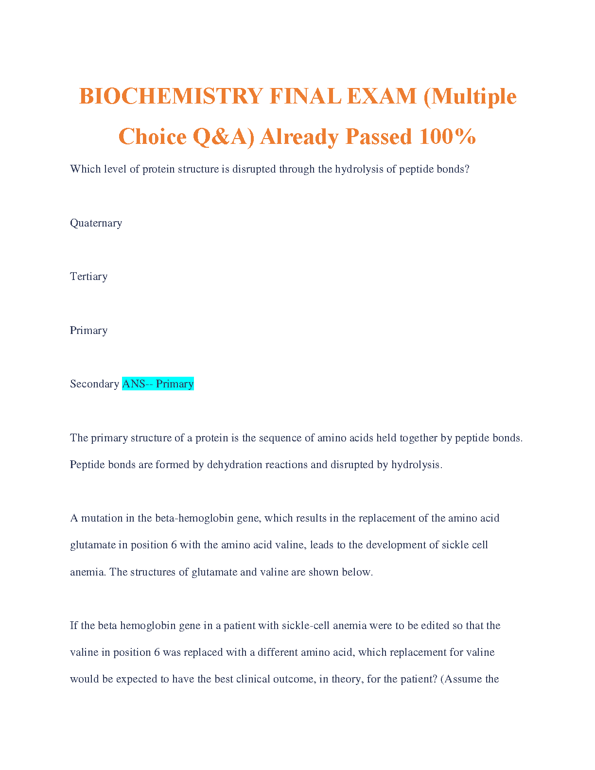 Biochemistry Final Exam (Multiple Choice Q&A) Already Passed 100% - Ace Your Exam on the First Attempt