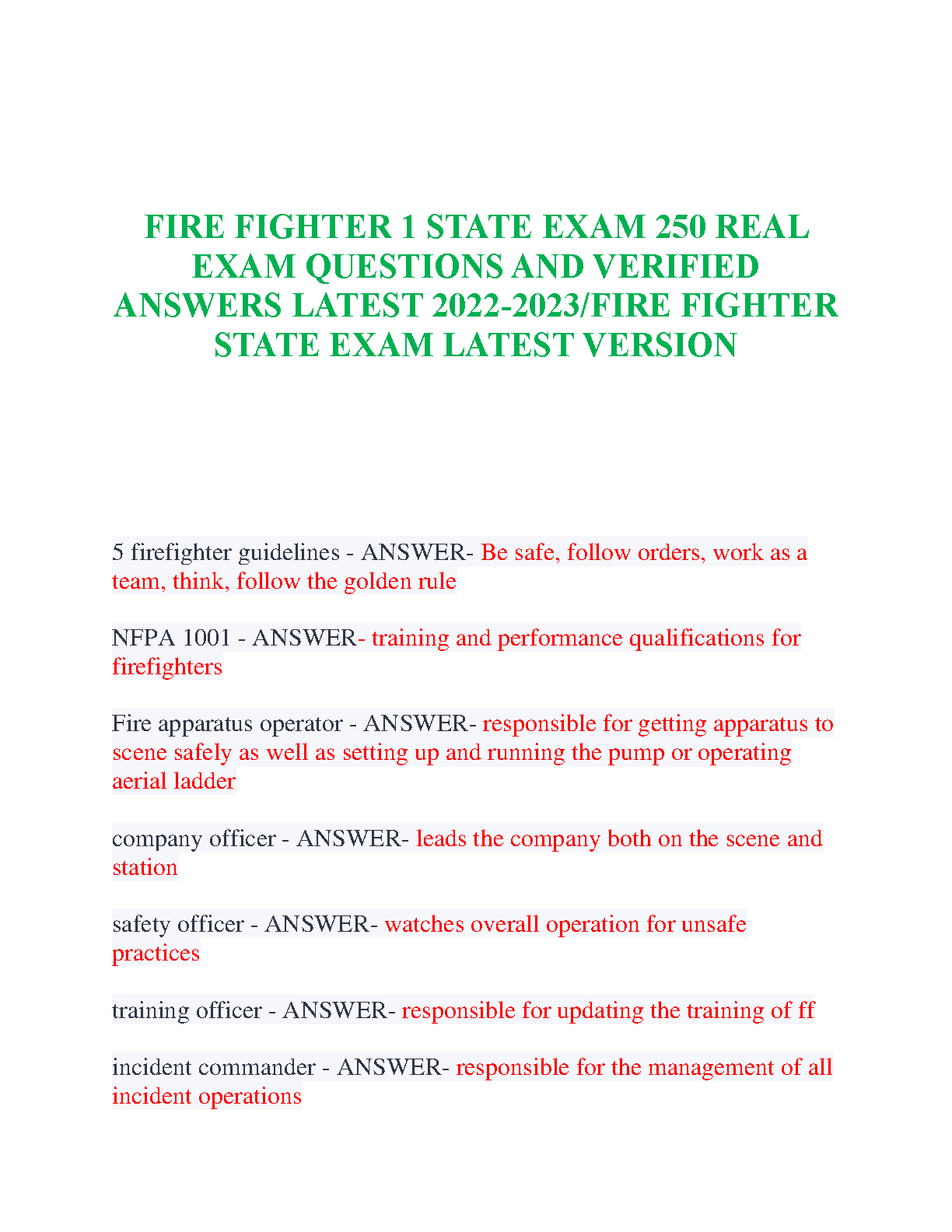 Fire Fighter 1 State Exam 2022-2023 Latest Version: 250 Real Exam Questions and Verified Answers by Anonymous Authors