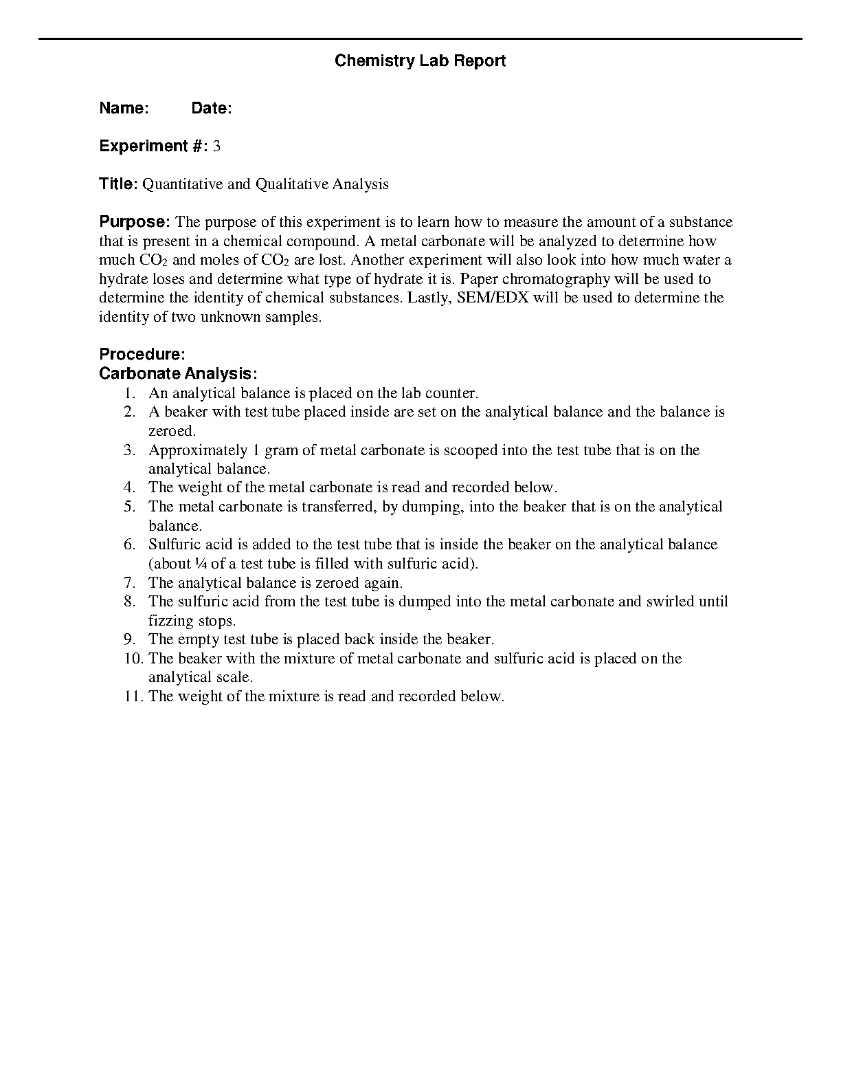This chemistry lab report guides you through an experiment designed to teach you how to measure the amount of a substance present in a chemical compound. It covers the analysis of a metal carbonate to determine water loss, hydrate type, and the identification of chemical substances.