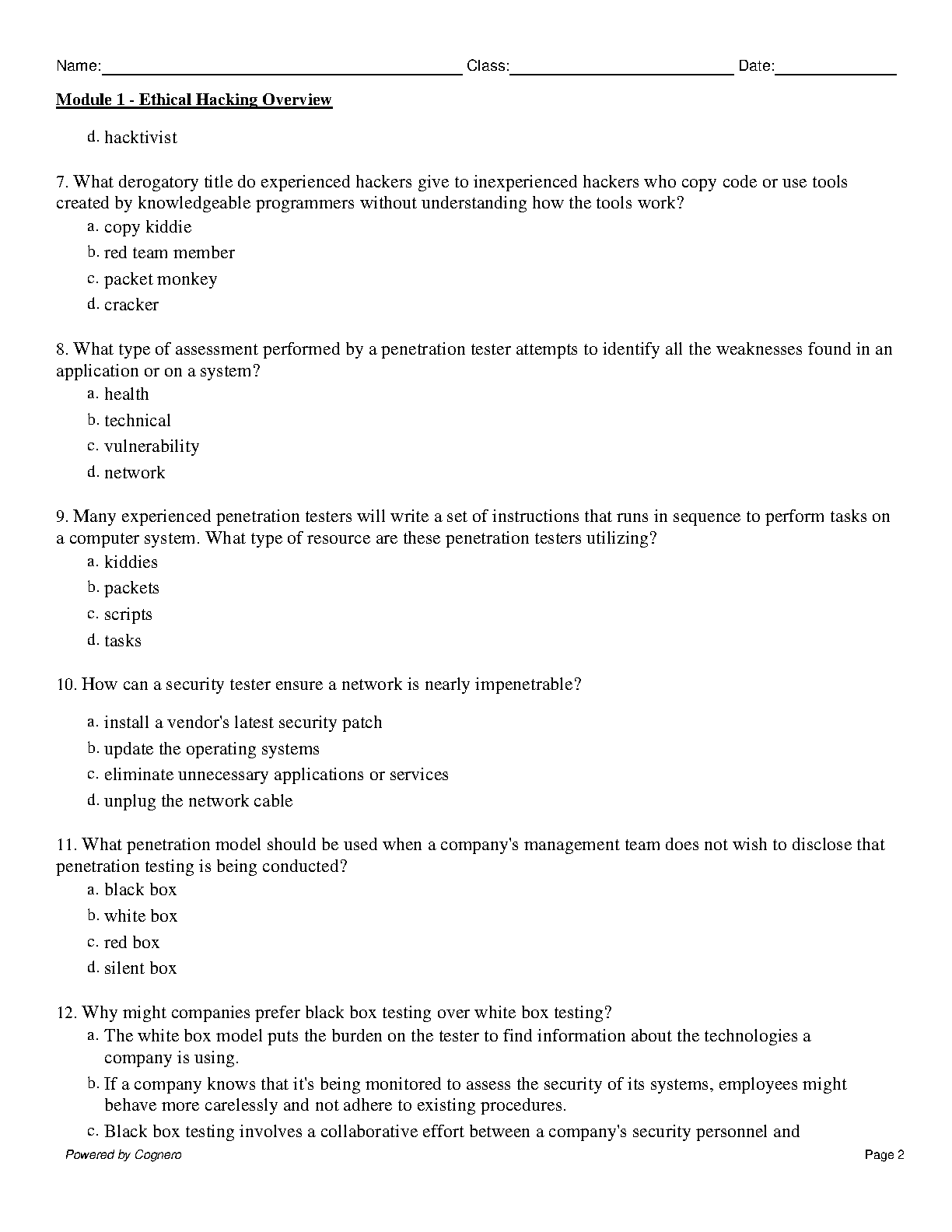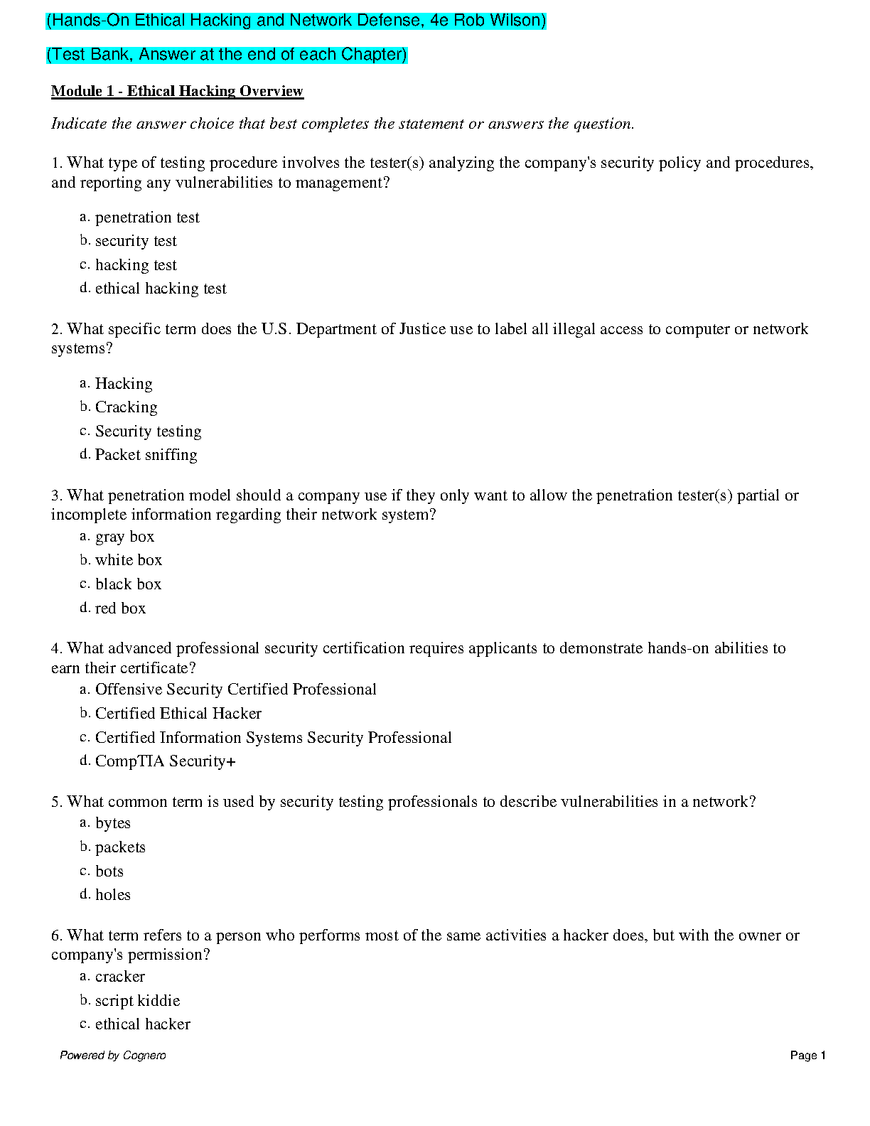 Ace your Ethical Hacking and Network Defense exams with this comprehensive Test Bank by Rob Wilson. This resource features hundreds of practice questions and answers, designed to cover every aspect of the course. Stay ahead of the curve and get ready for first-attempt success.