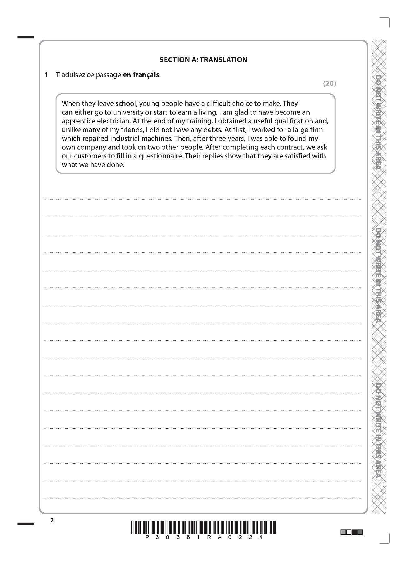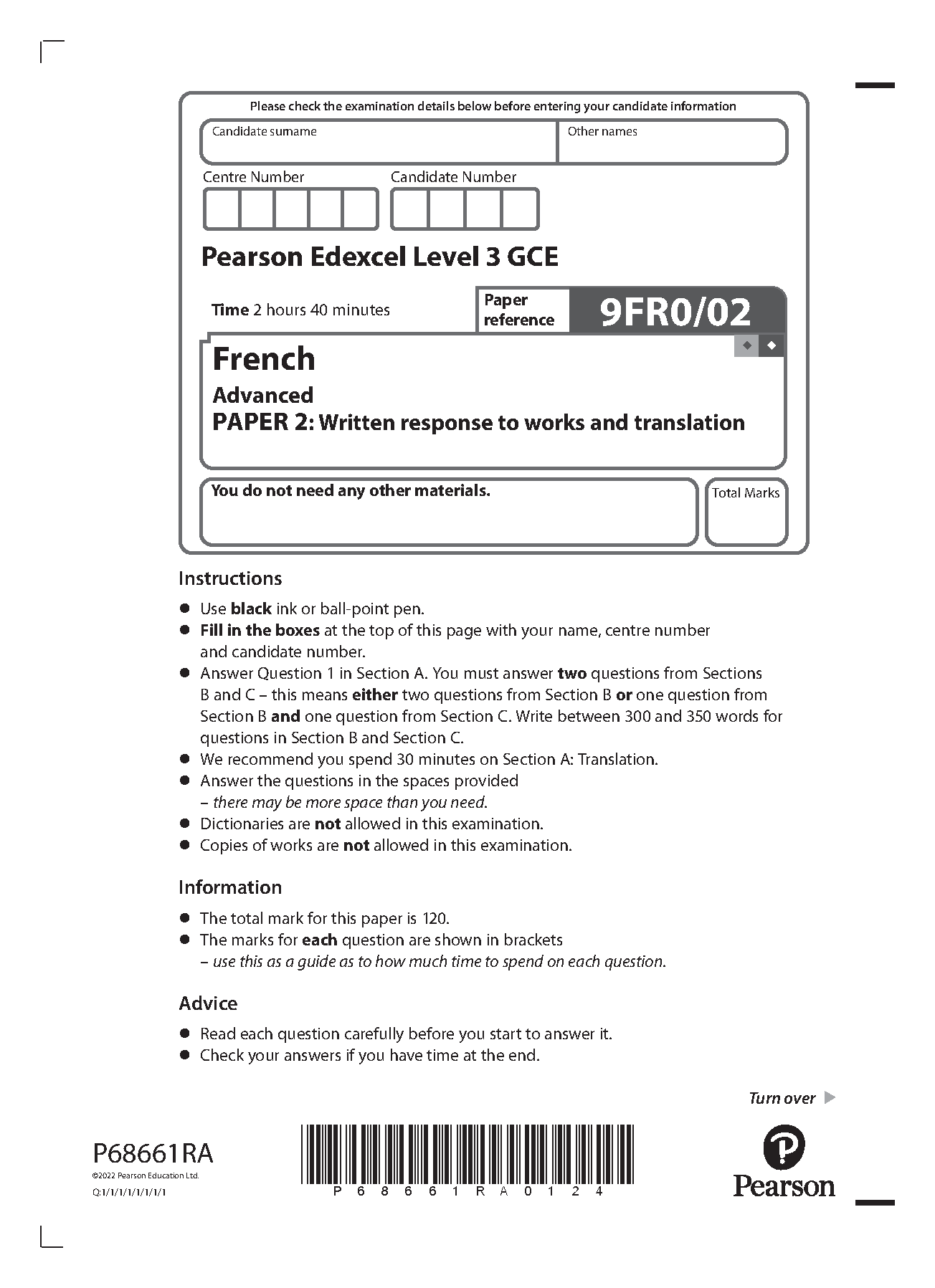 Pearson Edexcel Level 3 GCE French Advanced Paper 2: Written response to works and translation - 9FR0/02