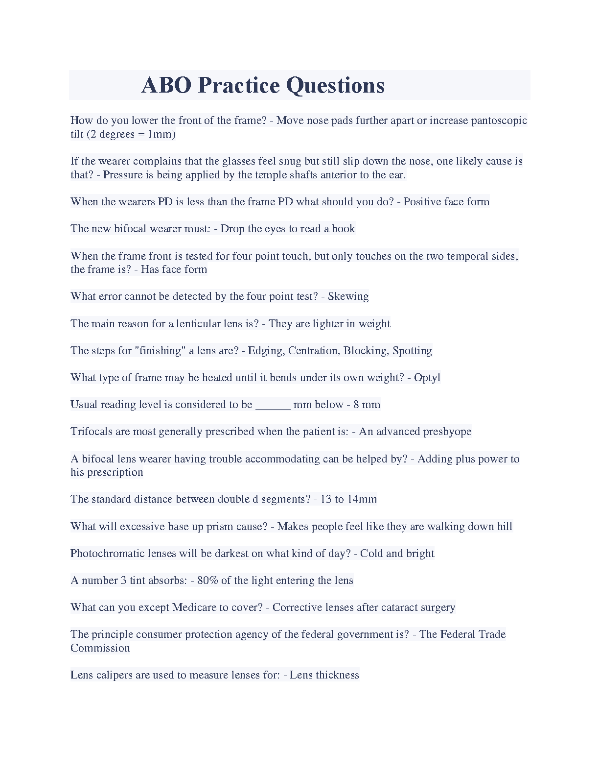 Get ready to ace your ABO exams with this comprehensive set of practice questions, designed to cover all the essential concepts you need to know. This resource offers a practical approach to learning, helping you build confidence and avoid resits. Start your journey towards success today.