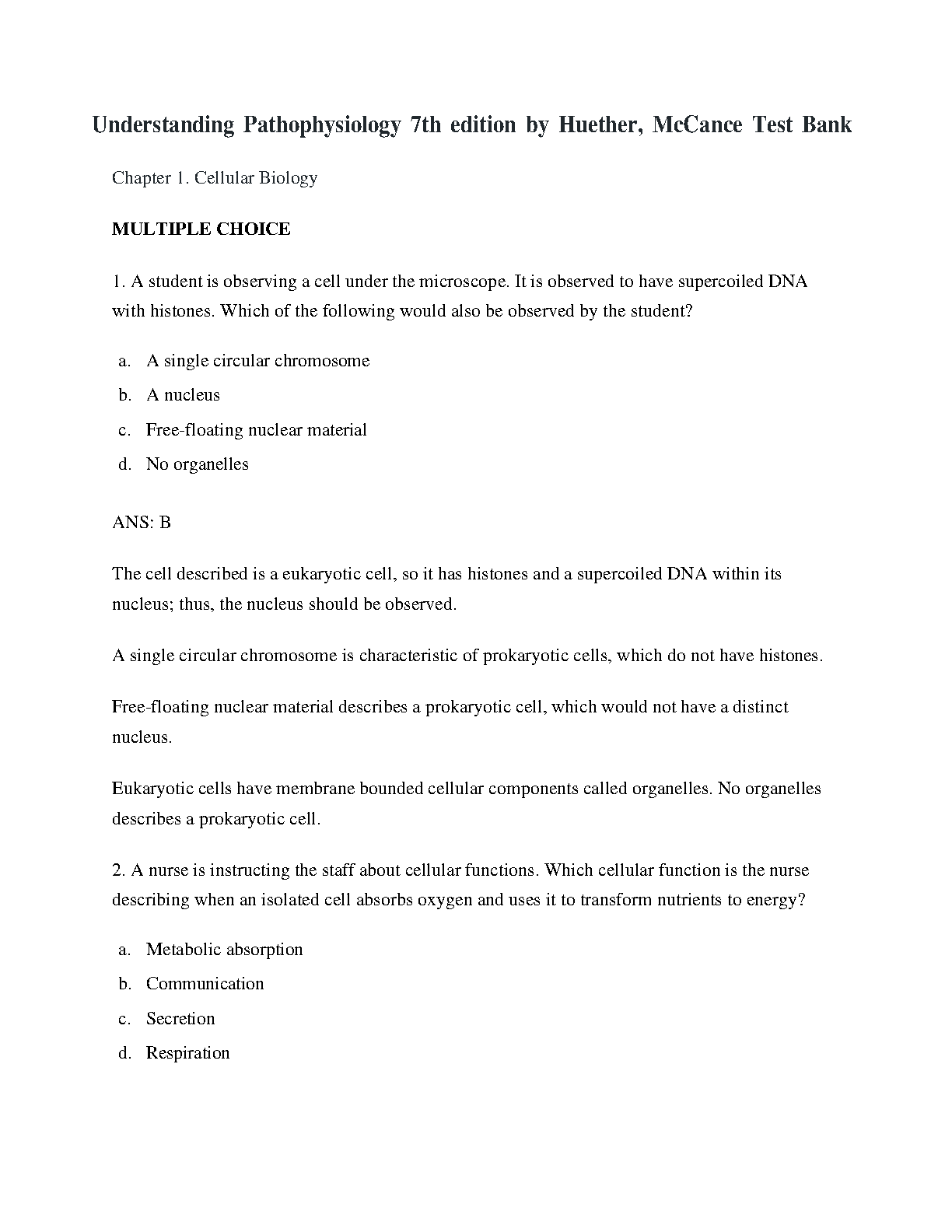 This test bank is designed to help students prepare for exams related to pathophysiology. It includes a variety of questions covering different aspects of the subject, such as cellular injury, inflammation, immunity, and cancer. This resource can be a valuable tool for understanding the concepts and preparing for exams.