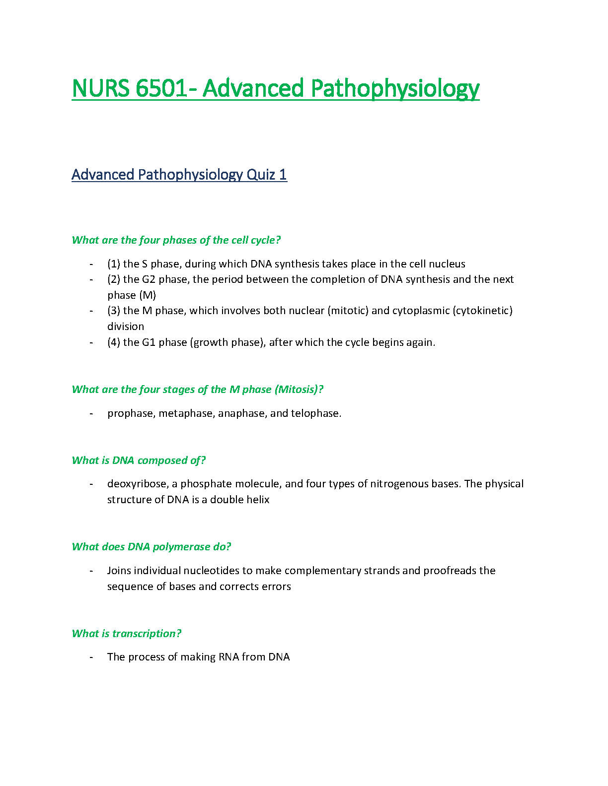 NURS 6501 - Advanced Pathophysiology Advanced Pathophysiology Quiz 1 RATED A+