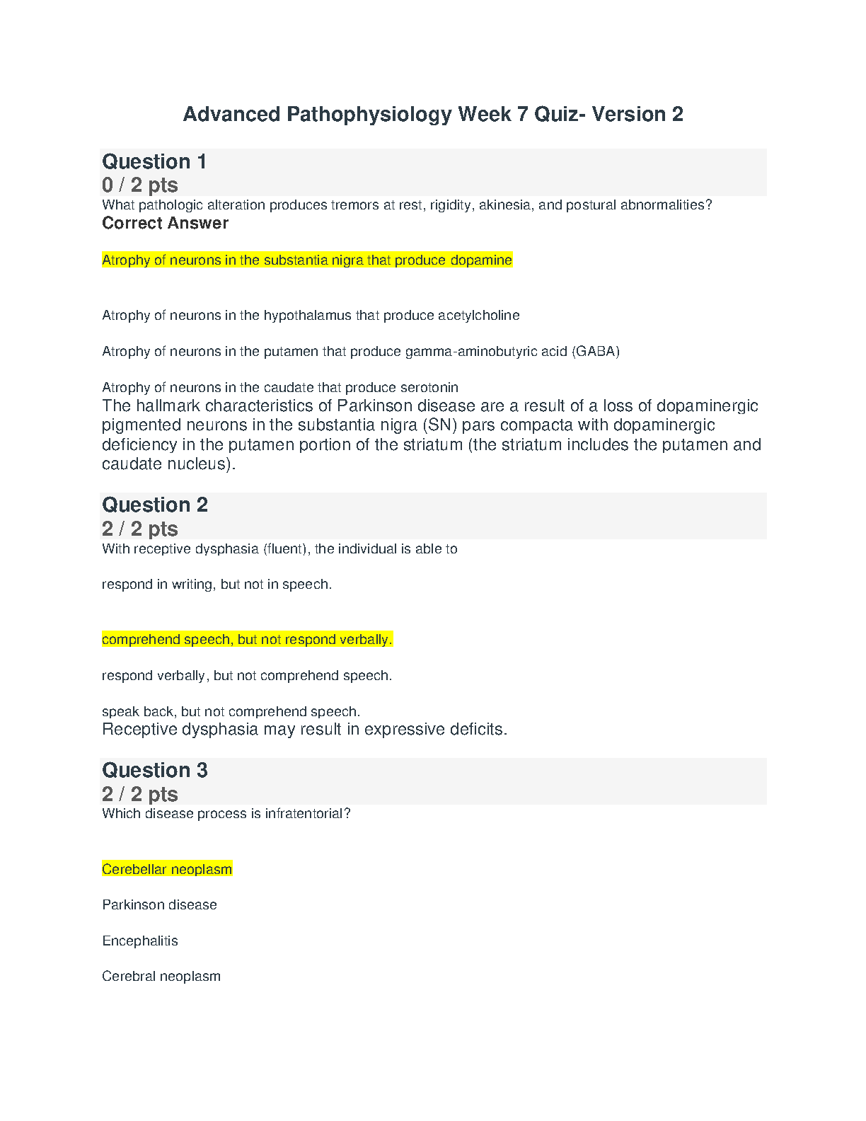 Advanced Pathophysiology Week 7 Quiz- Version 2 WITH CORRECT ANSWERS GRADED A+