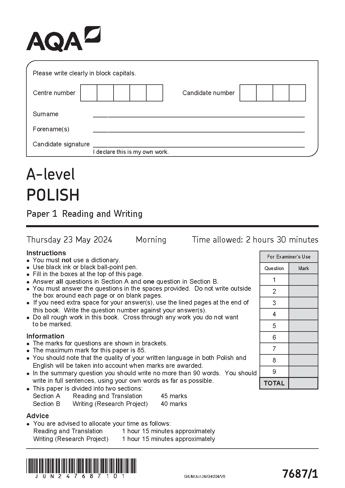 AQA A LEVEL POLISH QUESTION PAPER 1 2024 (7687/1: Reading and Writing).