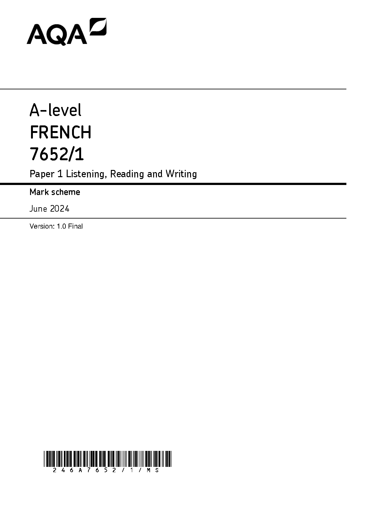 AQA A LEVEL FRENCH PAPER 1 MARK SCHEME (7652/1: Listening, Reading and Writing). DOWNLOAD THE OFFICIAL AND VERIFIED A LEVEL FRENCH: Listening, Reading and Writing 2024 ON www.hackedexams.com INSTANTLY.