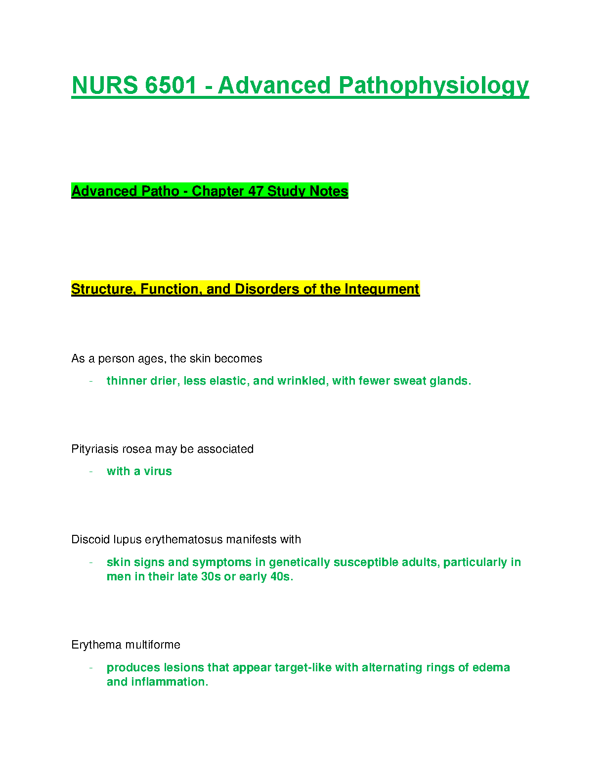 NURS 6501 - Advanced Pathophysiology Advanced Patho - Chapter 47 Study Notes Structure, Function, and Disorders of the Integument LATEST UPDATE FOR 2023/2024
