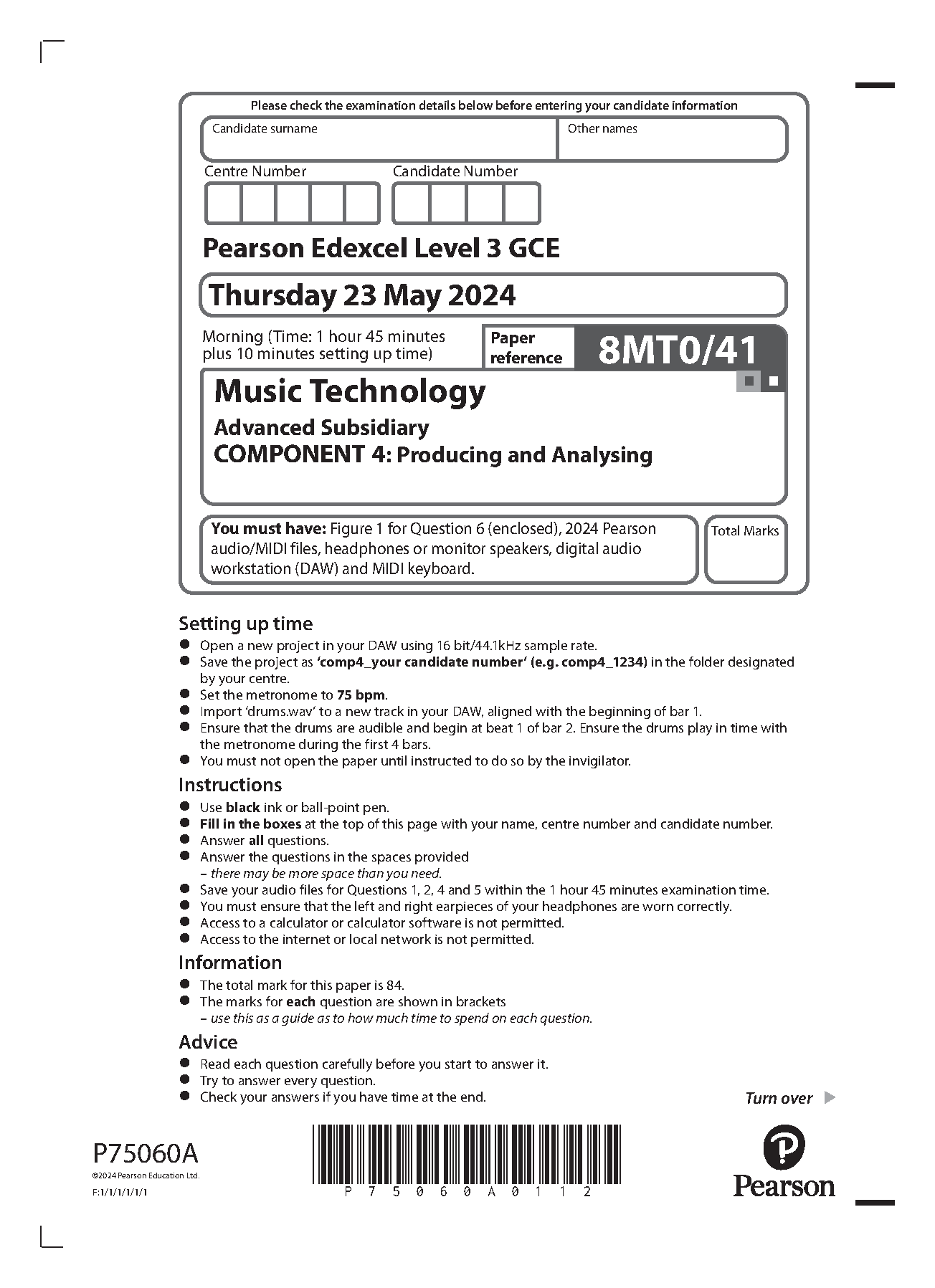 PEARSON EDEXCEL AS MUSIC TECHNOLOGY QUESTON PAPER 41 2024 (8MT0/41:Producing and Analysing).