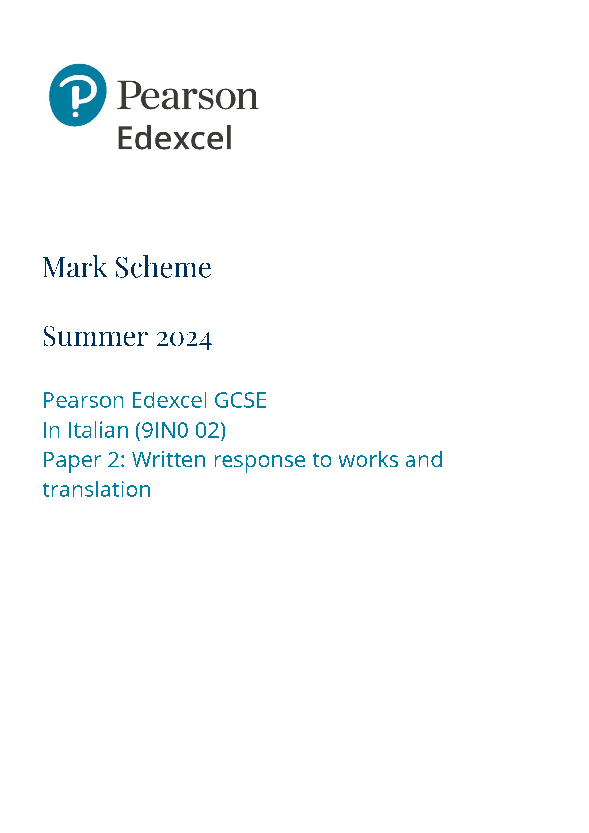 PEARSON EDEXCEL ITALIAN ADVANCED MARK SCHME PAPER 2 2024 (9IN0/02:Written response to works and translation ).