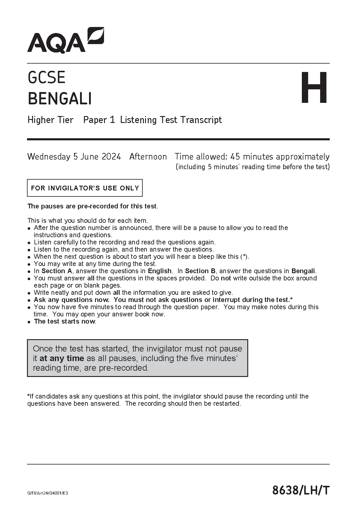 2024 AQA GCSE BENGALI QUESTION PAPER 1 (8638/LH/T: Higher Tier Listening Test Transcript). DOWNLOAD THE OFFICIAL AND VERIFIED AQA GCSE BENGALI QUESTION PAPER 1 2024 ON www.hackedexams.com