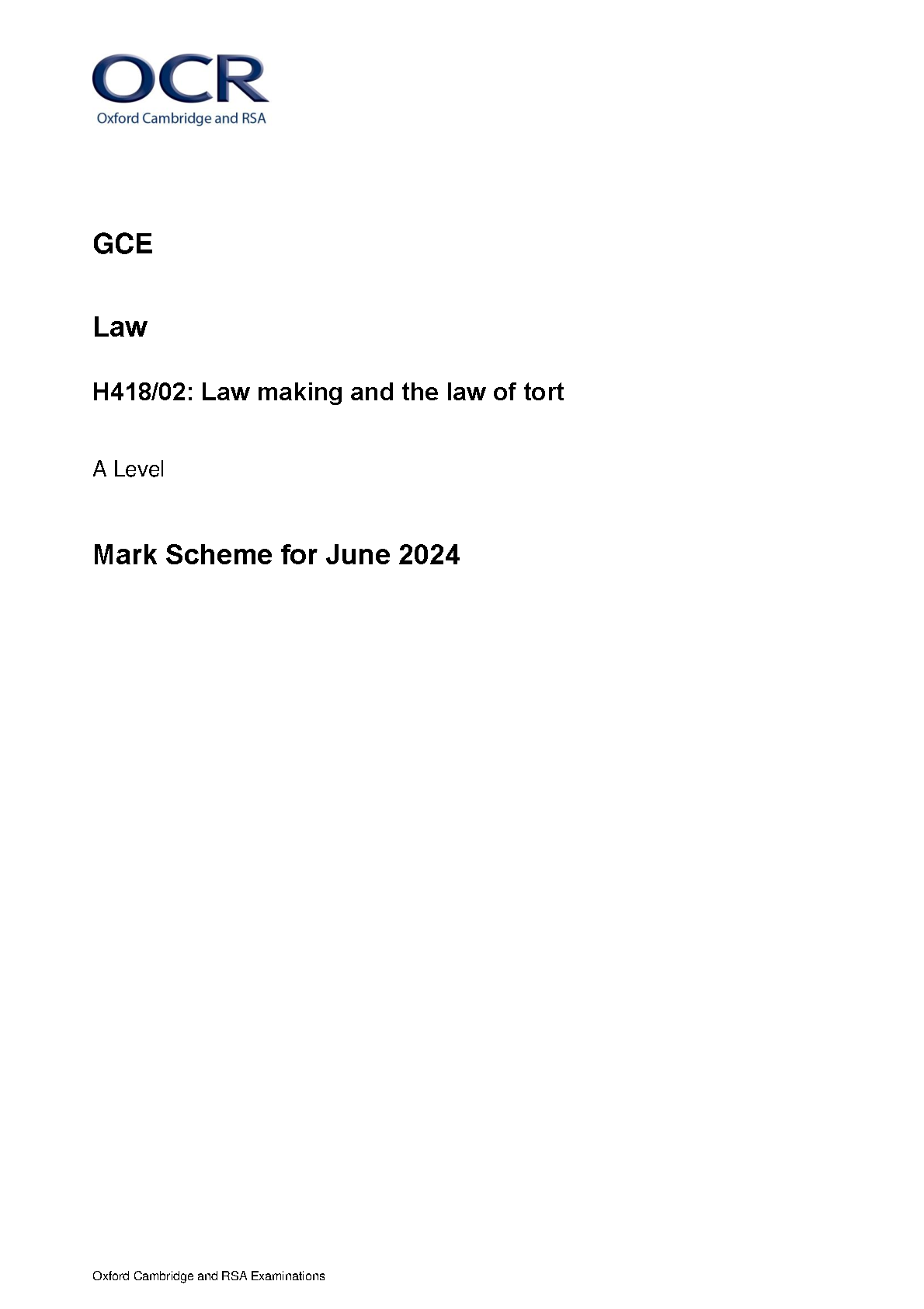 2024 OCR A LEVEL LAW MARK SCHEME PAPER 2 (H418/02: Law making and the law of tort). DOWNLOAD THE OFFICIAL AND VERIFIED OCR A LEVEL LAW PAPER 2 2024 ON www.hackedexams.com INSTANTLY