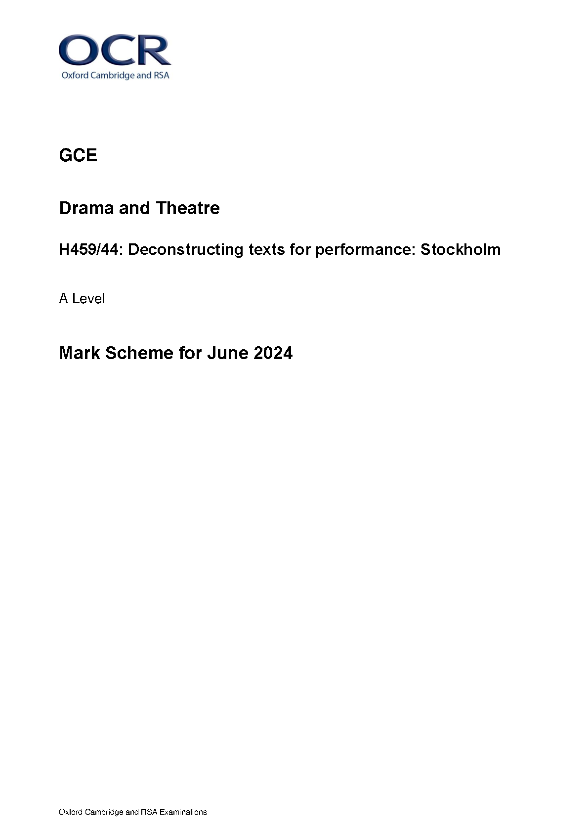 2024 OCR A LEVEL DRAMA AND THEATRE MARK SCHEME PAPER 44 (H459/44: Deconstructing texts for performance: Stockholm).