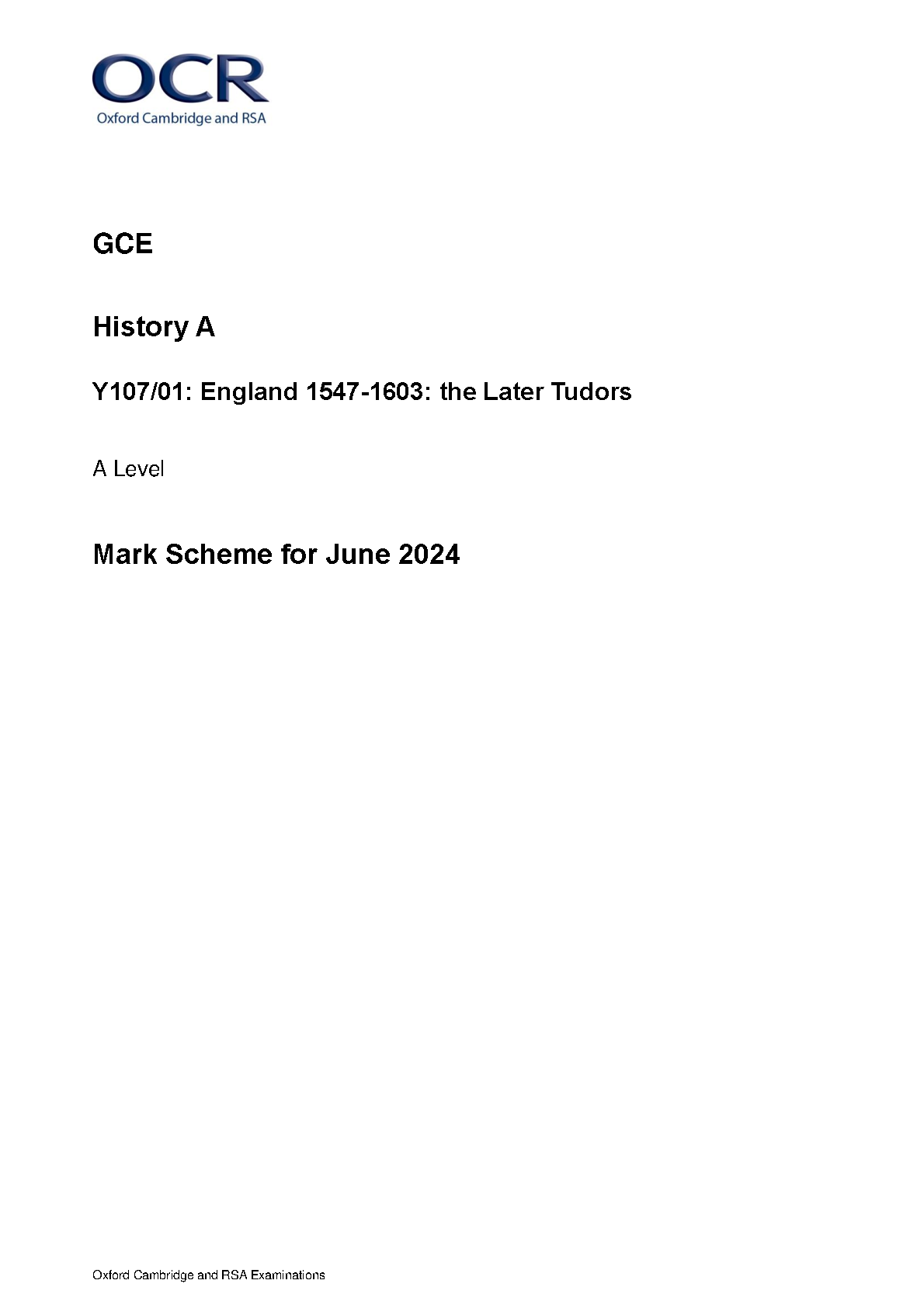 2024 OCR A LEVEL HISTORY A MARK SCHEME PAPER 1 (Y107/01: England 1547-1603: the Later Tudors).