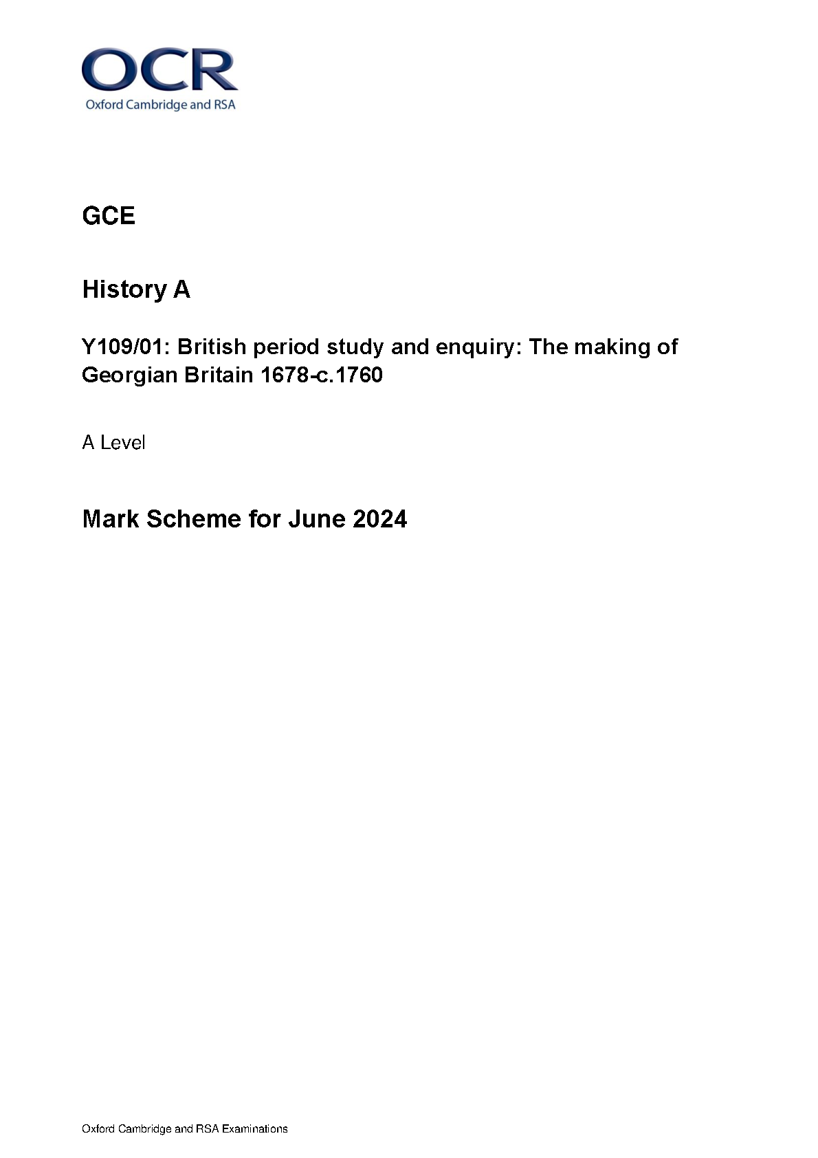 2024 OCR A LEVEL HISTORY A MARK SCHEME PAPER 1 (Y109/01: British period study and enquiry: The making of Georgian Britain 1678-c.1760).