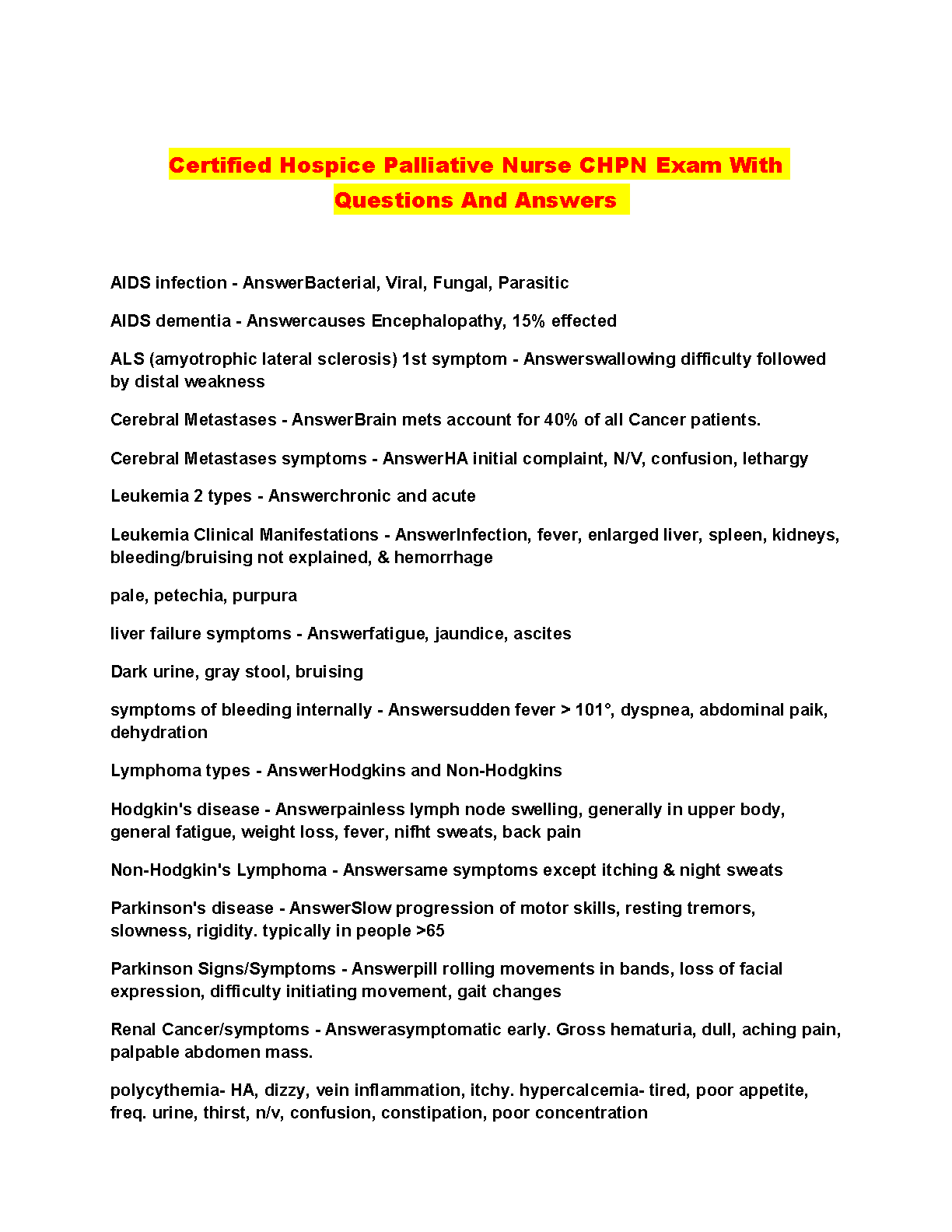 Certified Hospice Palliative Nurse CHPN Exam With Questions And Answers - Edition 2024/2025