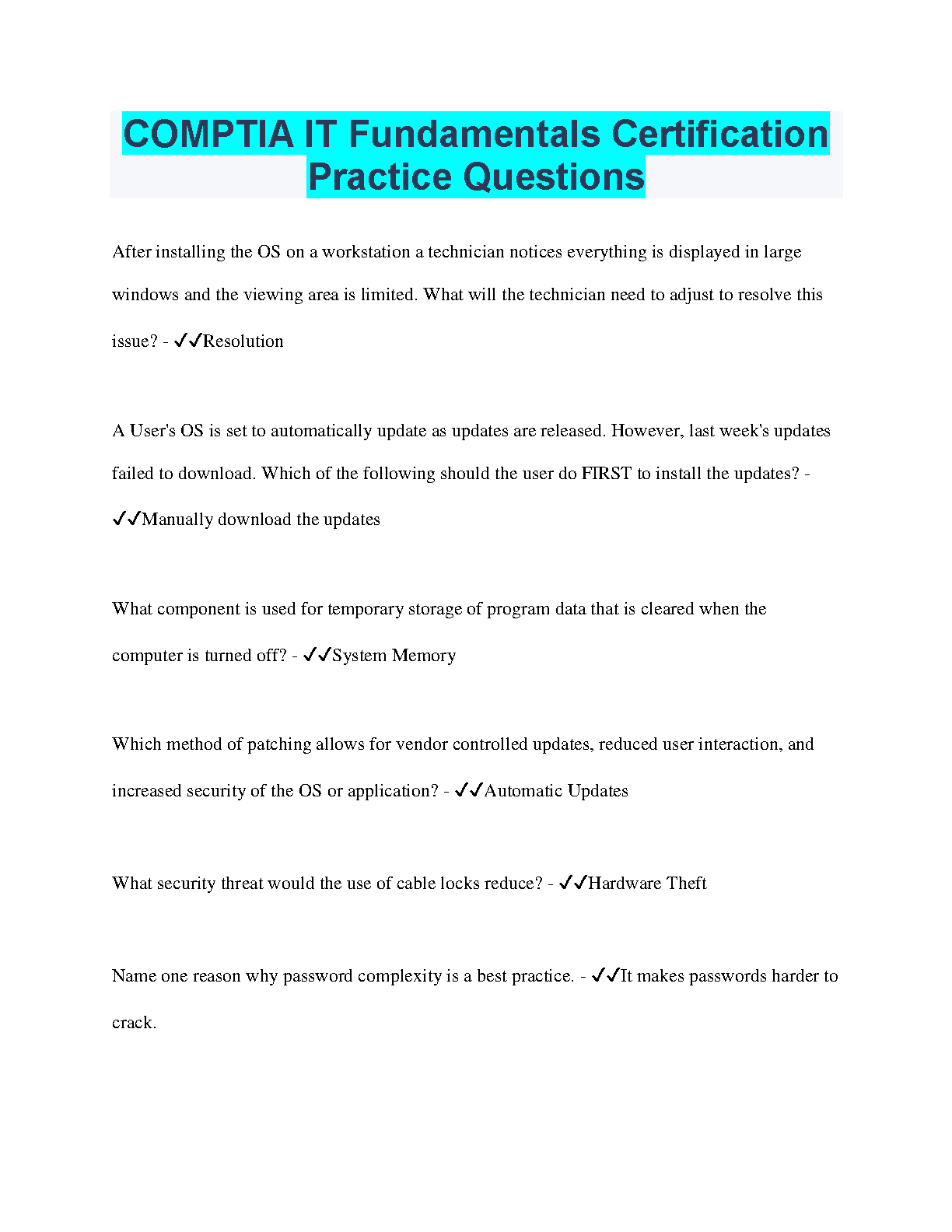 Ace your CompTIA IT Fundamentals Certification exam with these comprehensive practice questions, designed to help you master the concepts and pass on your first attempt. This resource is meticulously crafted to cover all the essential topics and provides realistic exam simulations.