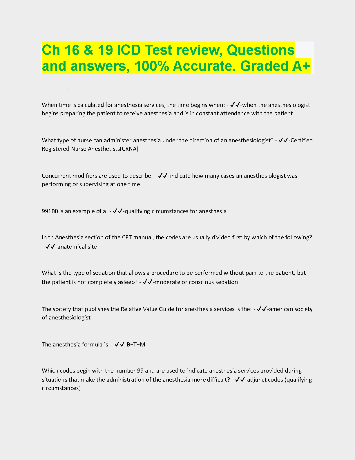 This resource is a comprehensive guide for students studying ICD codes, covering Chapters 16 and 19. It includes multiple-choice questions with detailed explanations for each answer. The resource is graded A+ and 100% accurate, making it the perfect tool for achieving exam success.