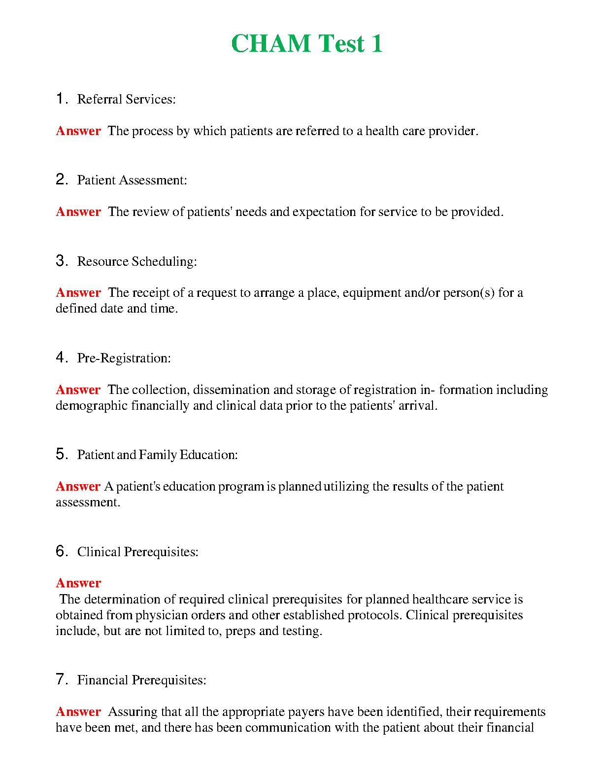 Ace your CHAM exam on the first try with this comprehensive study guide. This resource covers key concepts in healthcare administration, including referral services, patient assessment, resource scheduling, pre-registration, patient and family education, clinical prerequisites, and financial prerequisites.
