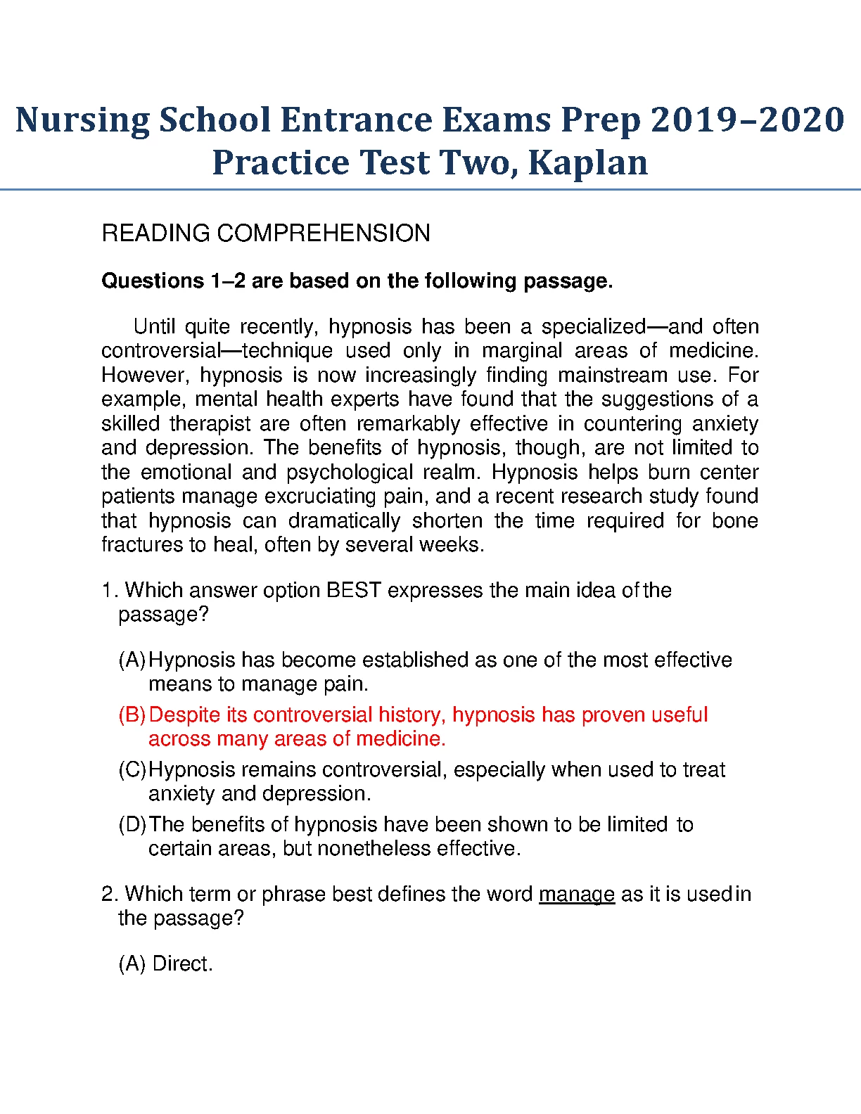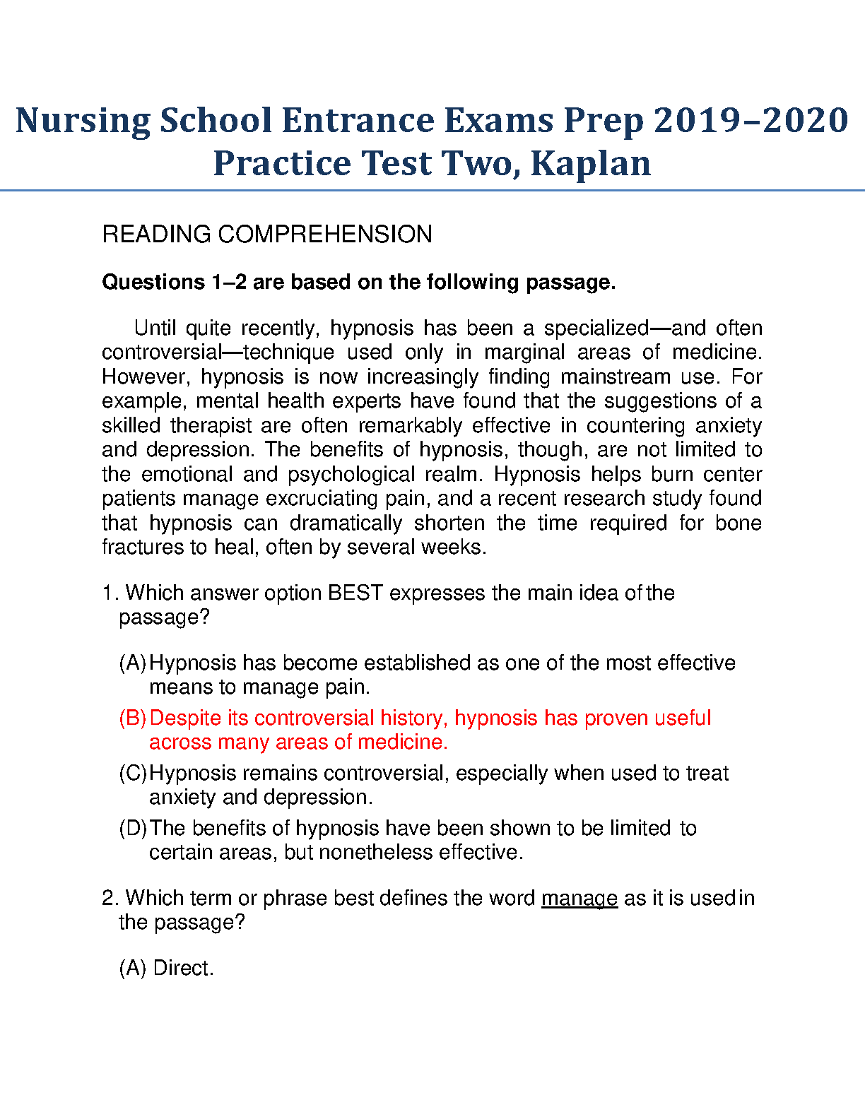 Nursing School Entrance Exams Prep 2022/2023 Practice Test Two, Kaplan