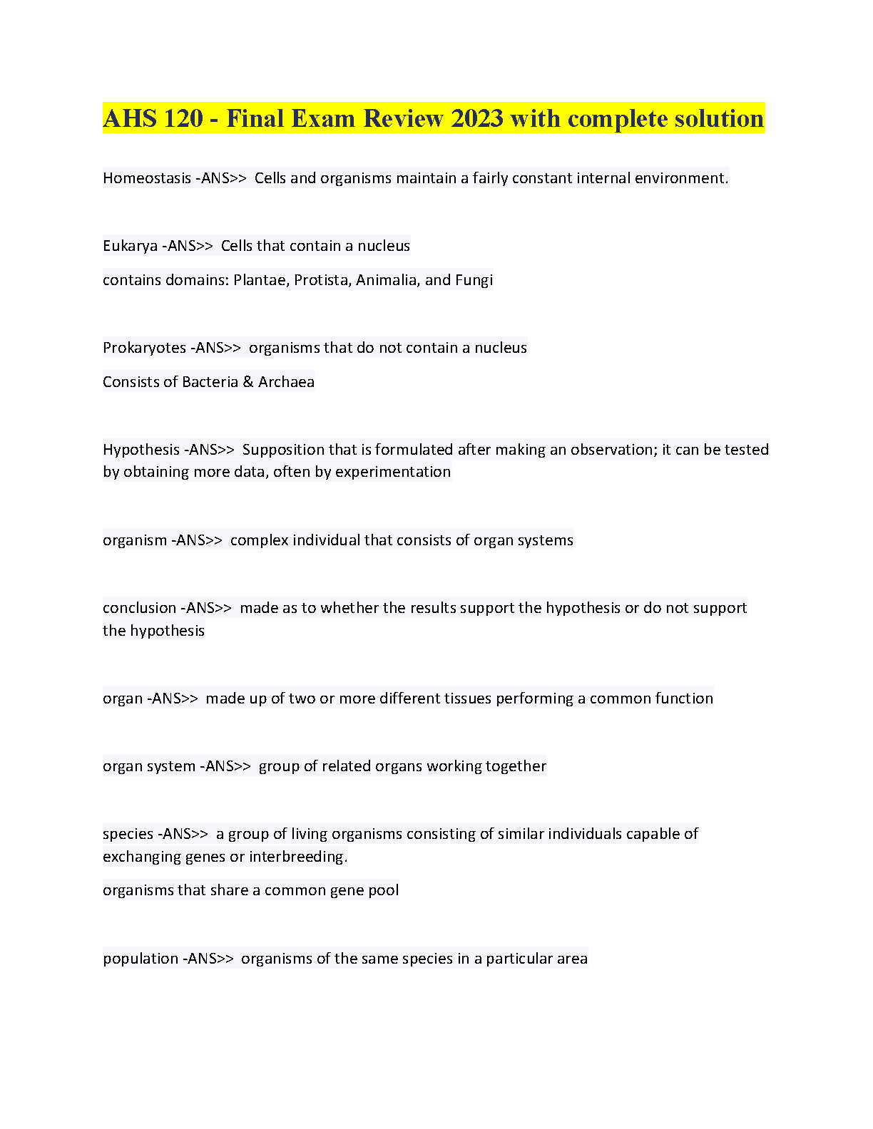 AHS 120 - Final Exam Review 2023 with Complete Solutions