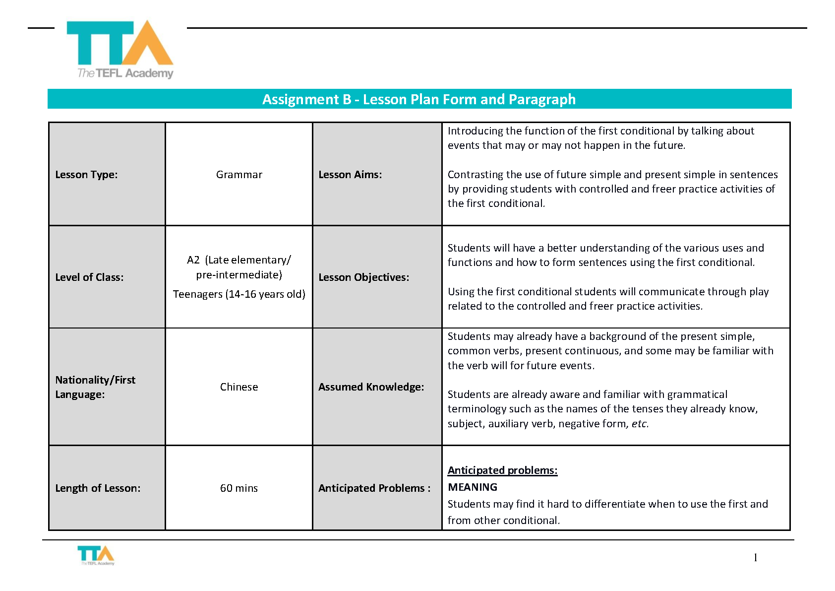First Conditional Lesson Plan for A2 Level ESL Students: A TEFL Academy Resource