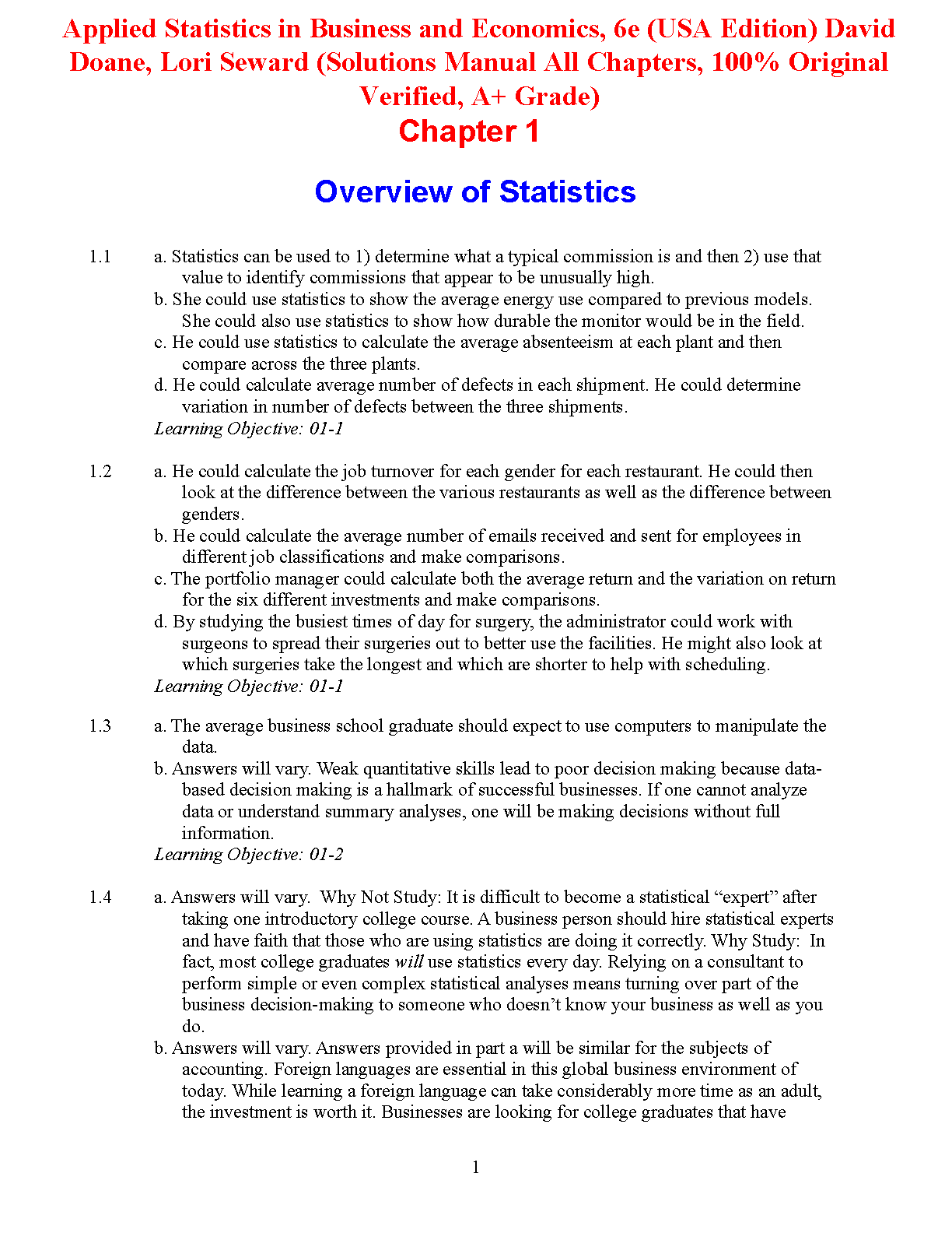 Applied Statistics in Business and Economics, 6e (USA Edition) David Doane, Lori Seward (Solutions Manual All Chapters, 100% Original Verified, A+ Grade)