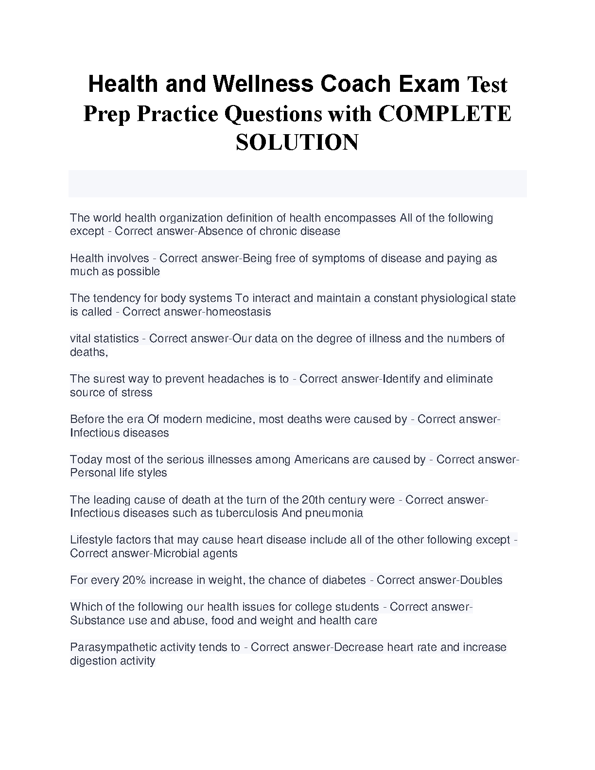 Prepare for your Health and Wellness Coach Exam with this comprehensive set of practice questions and complete solutions. This resource covers all the essential topics and concepts to help you ace your exam on the first try and avoid any resits. Get confident and ready to succeed!
