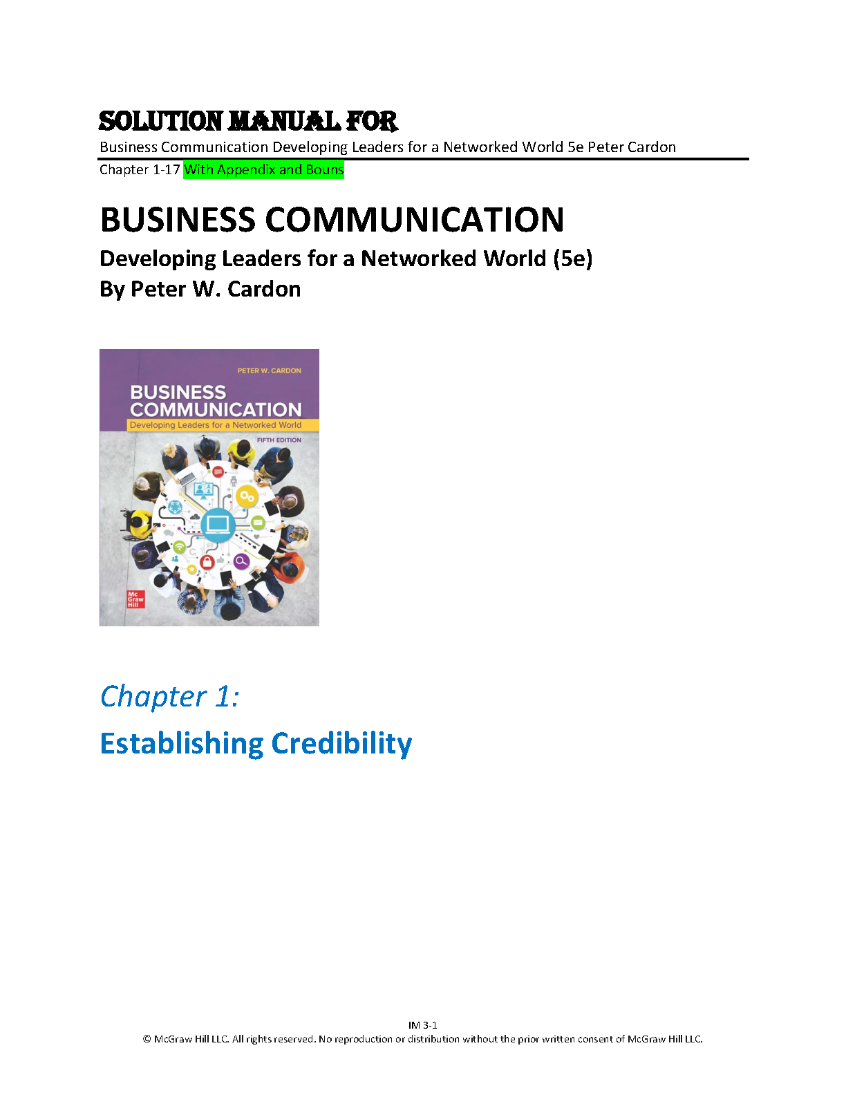 Get ready to excel in your Business Communication course with this comprehensive solution manual for the 5th edition of "Business Communication: Developing Leaders for a Networked World" by Peter W. Cardon. This resource provides complete solutions and insights for every chapter, ensuring your understanding of key concepts and enhancing your problem-solving skills.