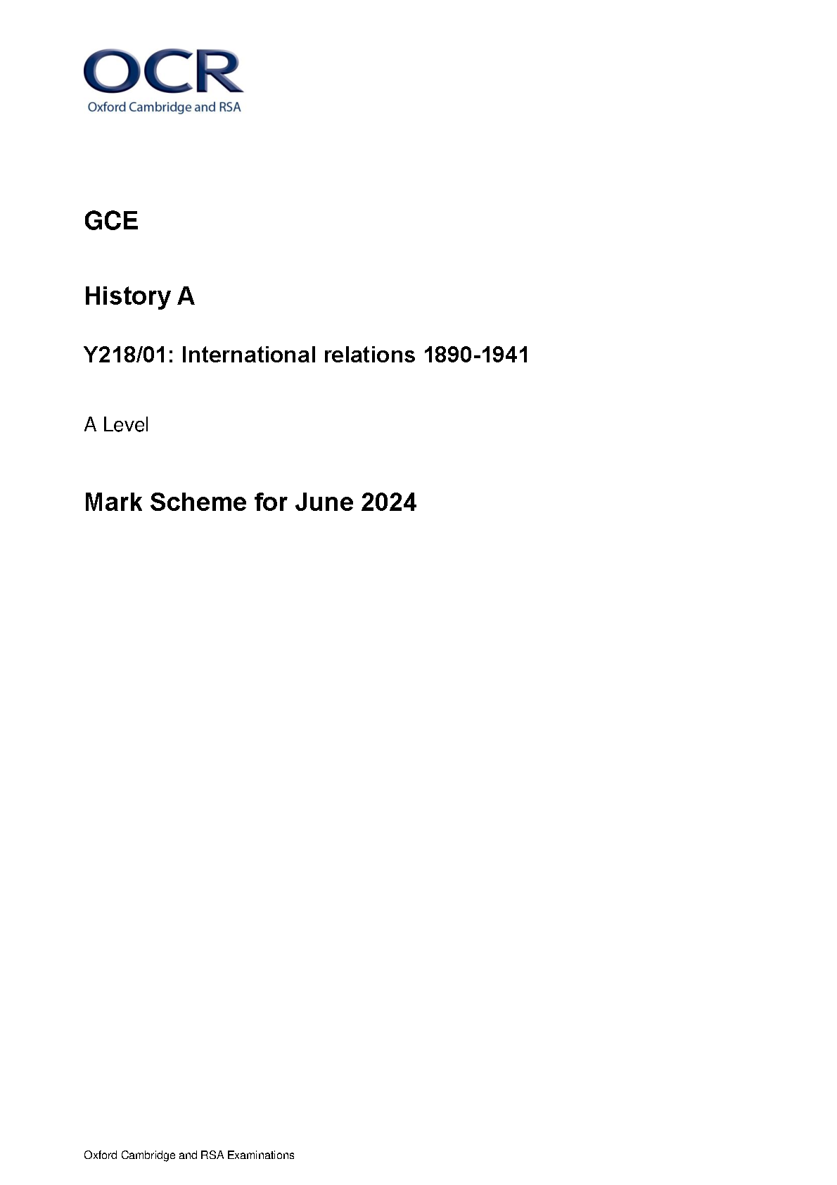2024 OCR A LEVEL HISTORY A MARK SCHEME PAPER 1 (Y218/01: International relations 1890-1941).