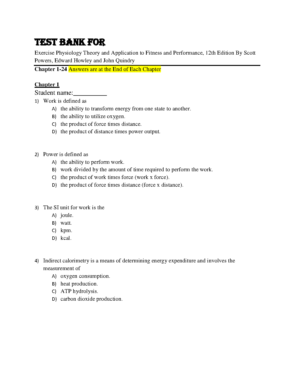 Exercise Physiology Theory and Application to Fitness and Performance 12th Edition Test Bank by Scott Powers, Edward Howley and John Quindry