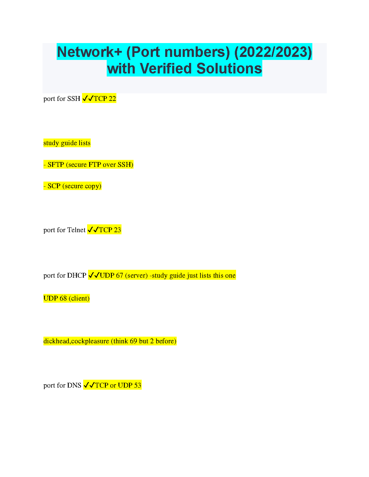 Network+ (Port Numbers) 2022/2023 Edition - Comprehensive Study Guide with Verified Solutions
