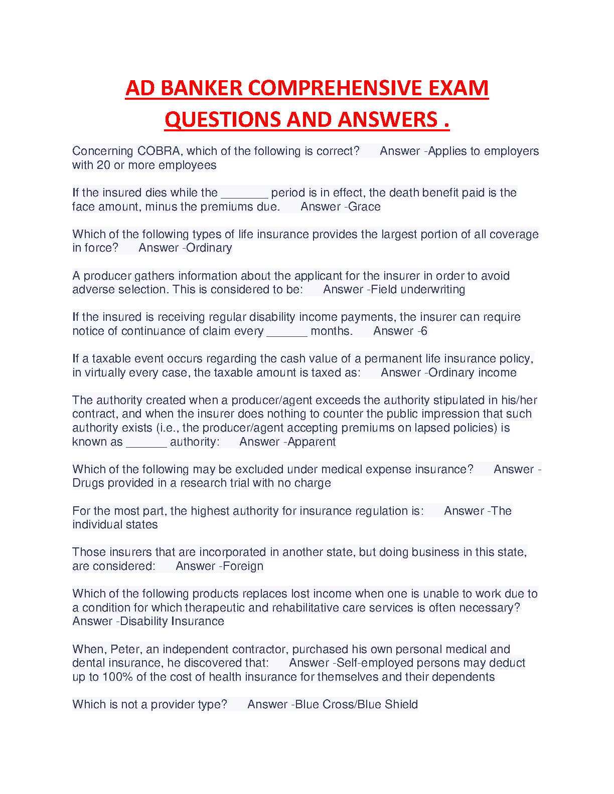 AD Banker Comprehensive Exam Questions and Answers - 2024/2025 Edition - Ace Your Insurance Exams on the First Attempt!