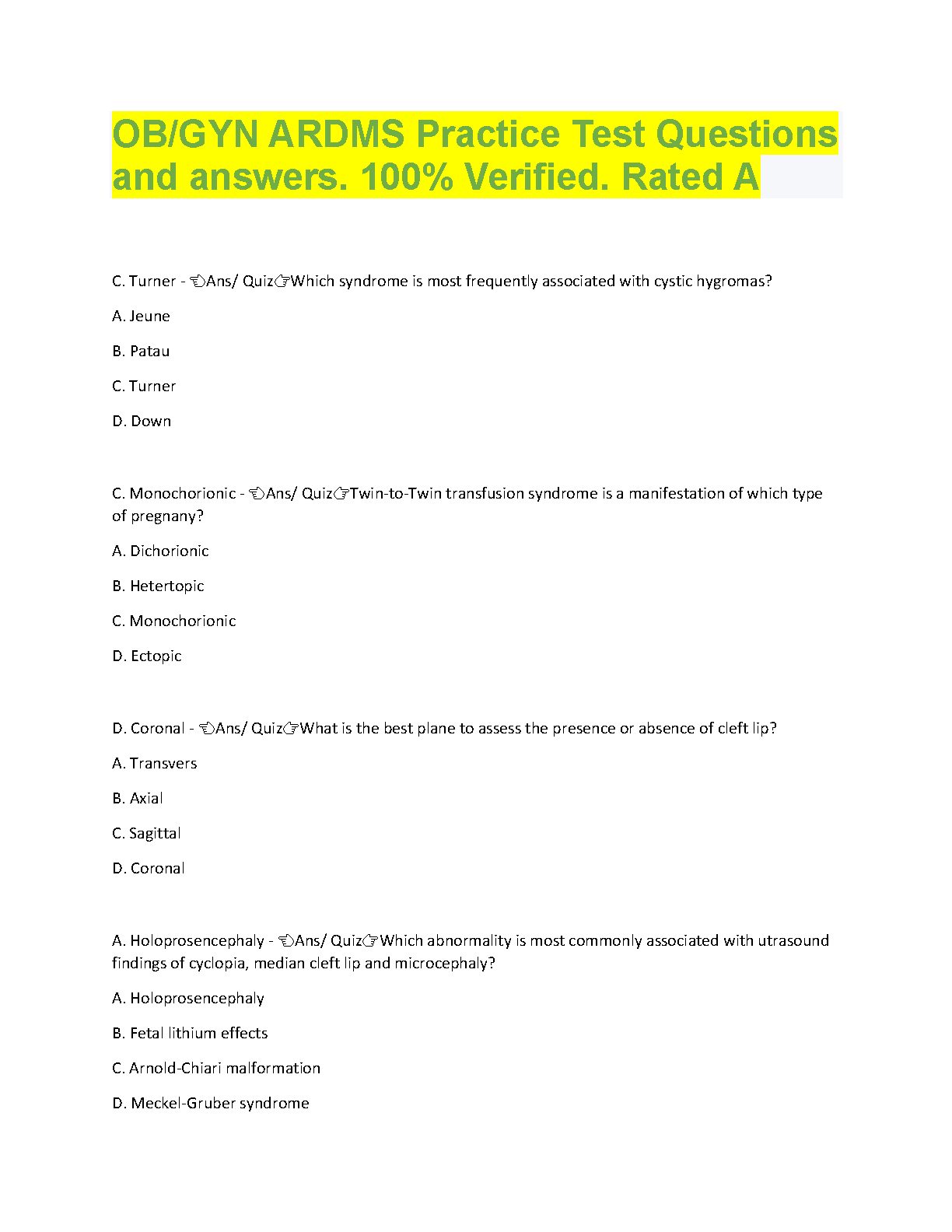 OB/GYN ARDMS Practice Test Questions and Answers - 100% Verified - Rated A 2024/2025 Edition