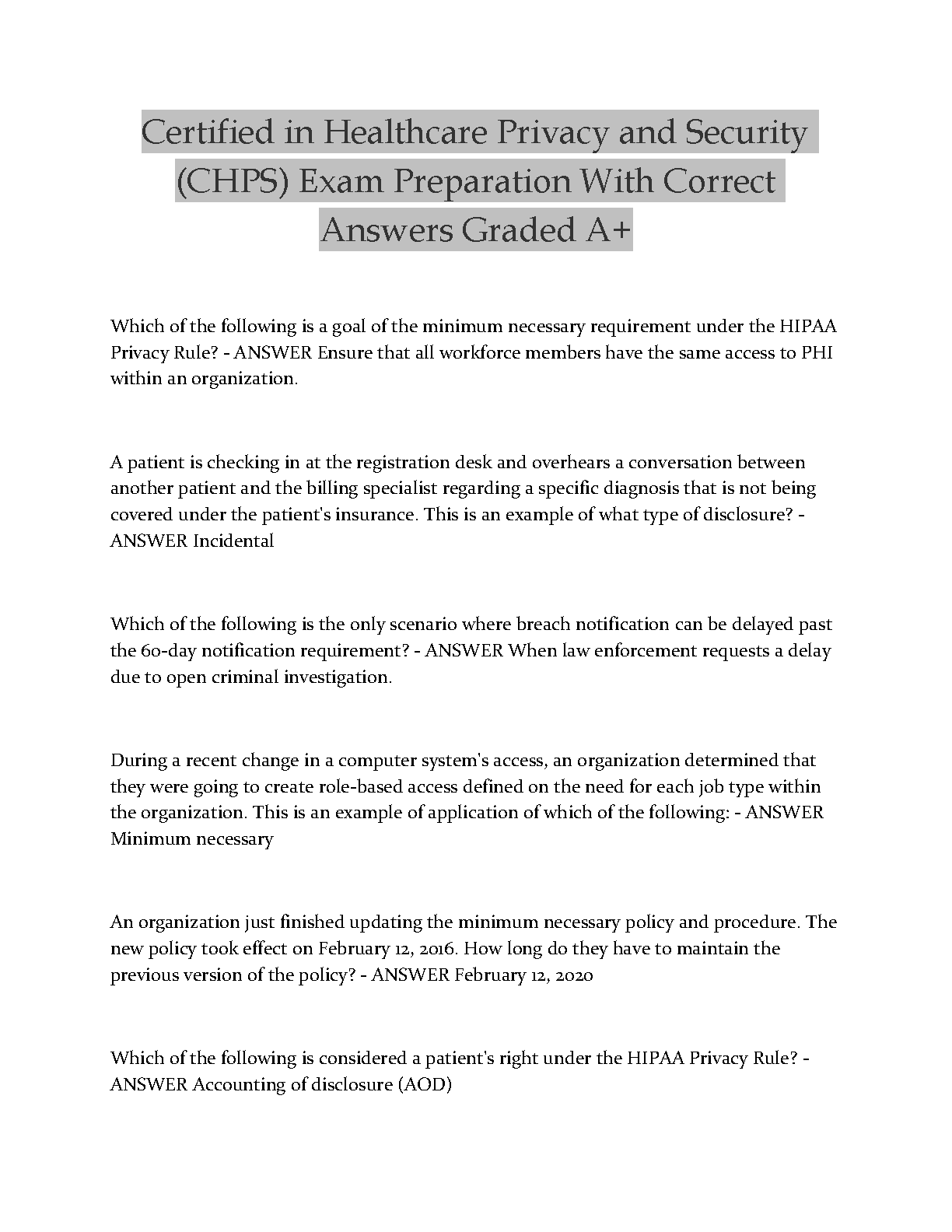 Certified in Healthcare Privacy and Security (CHPS) Exam Preparation With Correct Answers Graded A+ 2024/2025 Edition by [Author Name]