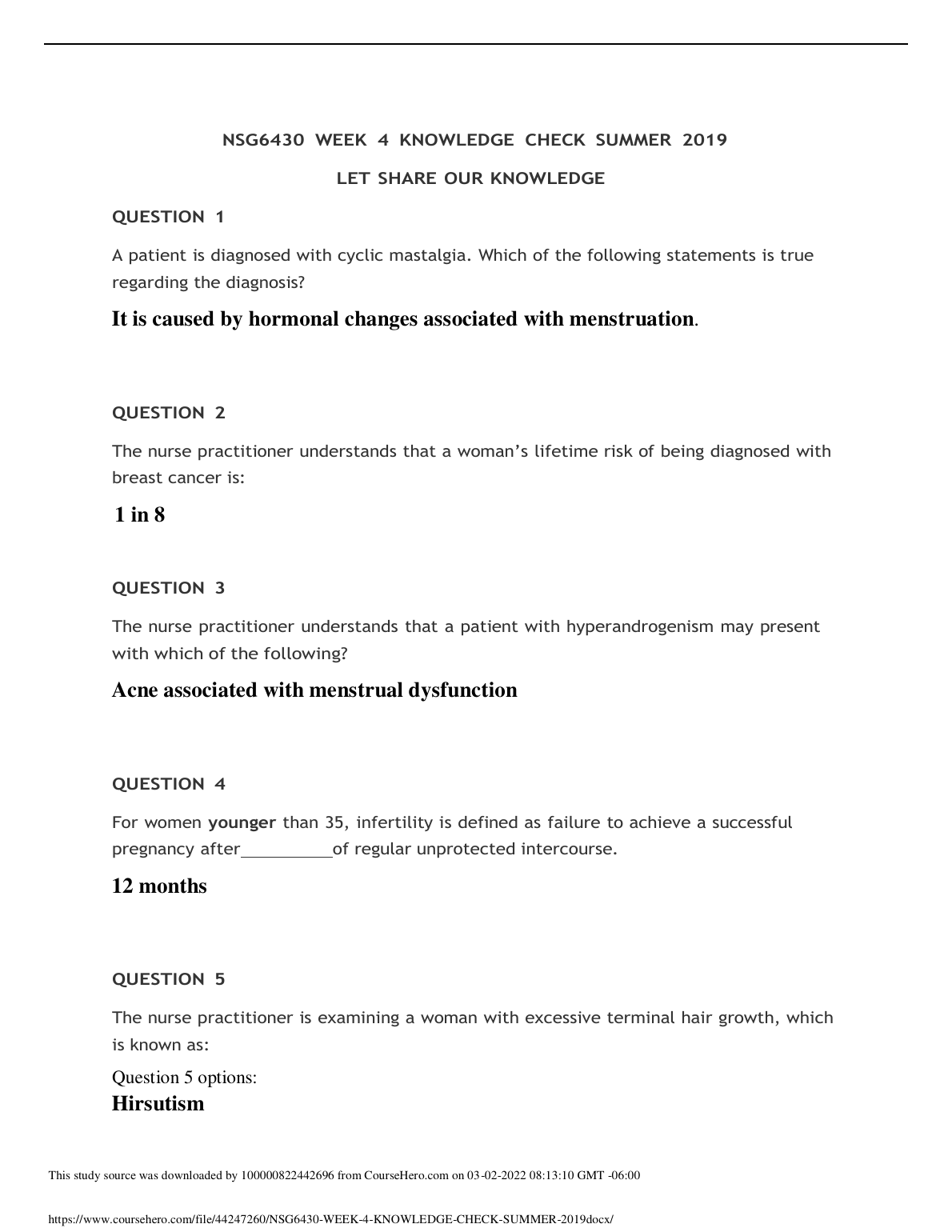 NSG6430 WEEK 4 KNOWLEDGE CHECK SUMMER 2019 LET SHARE OUR KNOWLEDGE UPDATED FOR 2023. DOWNLOAD on www.hackedexams.com INSTANTLY.
