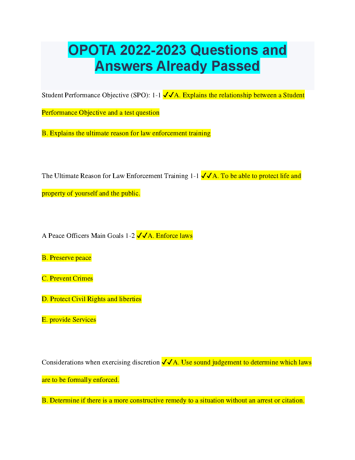This resource is designed to help students prepare for the OPOTA 2022-2023 exam. It includes questions and answers that have been previously passed by students. Use this to master the content and ace your exam on the first attempt.