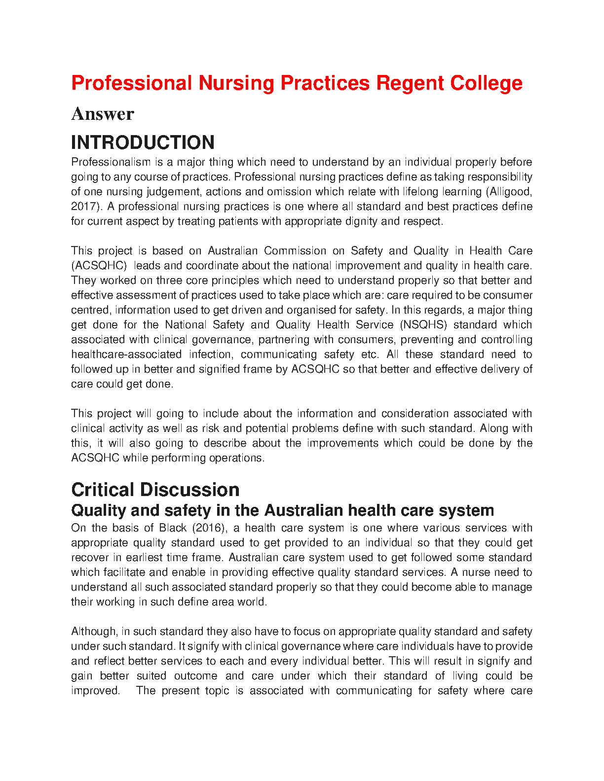 Professional Nursing Practices Regent College: A Comprehensive Guide to Quality and Safety in the Australian Healthcare System (2017 Edition) by Alligood